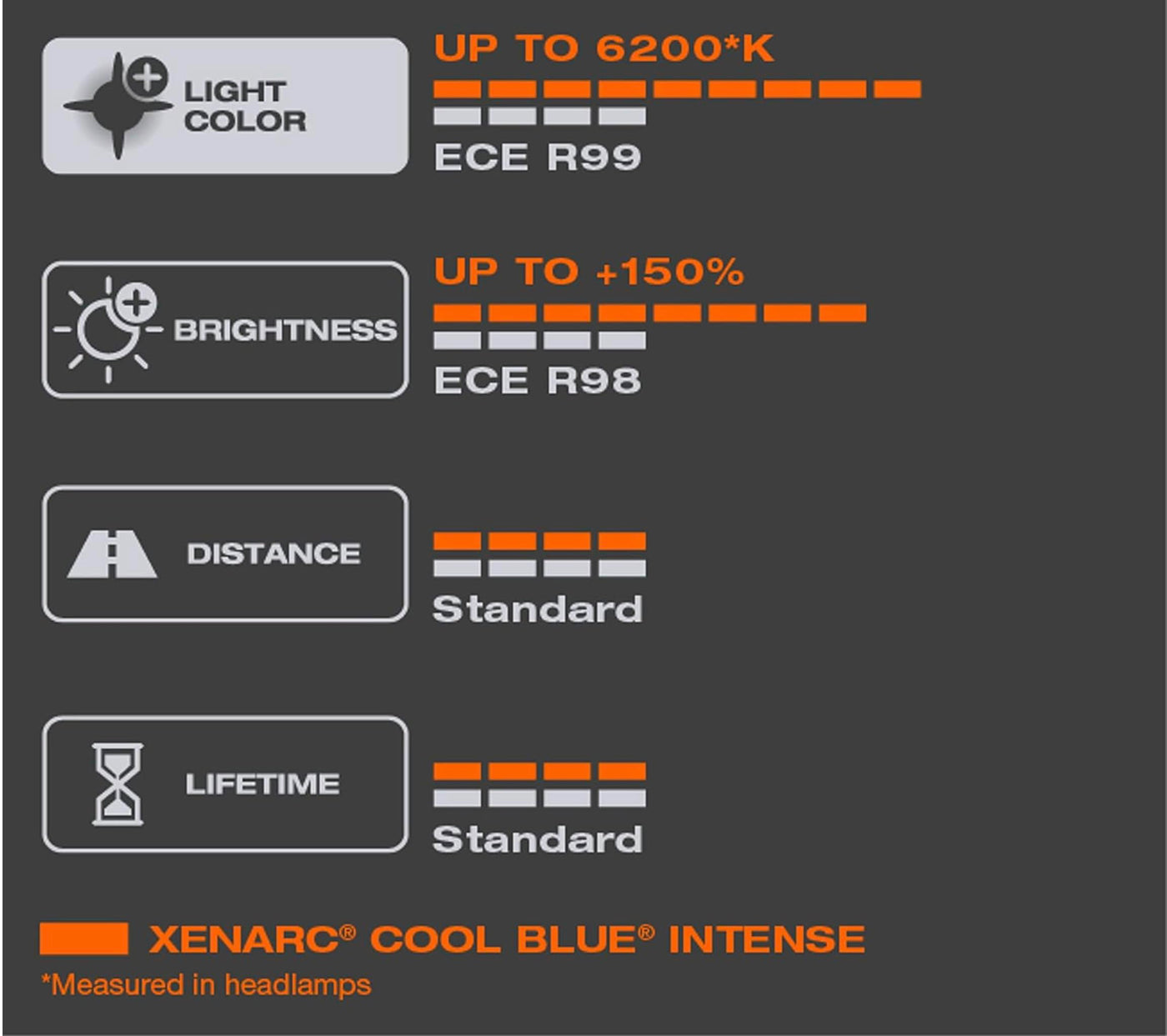 XENARC COOL BLUE INTENSE - discover that modern look at high power! With its extra white light for LED look, high-contrast xenon light, this automotive lamp appeals especially to drivers who like the perfect combination of stylish and individual design with exceptional road illumination. The high-tech xenon light with color temperatures of up to 6,200 Kelvin comes up with a highly efficient technology, brilliant effect and no-compromise design. Thanks to a special filling system which is used instead of conventional coating the lamp emits its extra white light. This stylish light creates a high-attention effect that helps you to be better seen by other motorists. Discover the exceptionally bright, high-contrast and brilliantly white light with up to 6,200 Kelvin and 150% more light! With XENARC COOL BLUE INTENSE, the night turns into day. Please note: XENARC lamp change is recommended to be carried out by a professional.