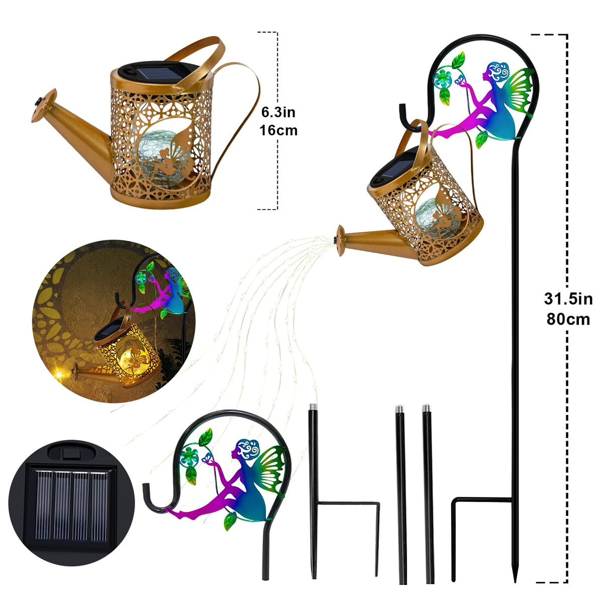 Q: Is the solar watering can waterproof?A: Yes, the solar watering can is designed with IP65 waterproof LED copper wire string lights and a sturdy metal construction that withstands various outdoor weather conditions, including rain, snow, and frost.