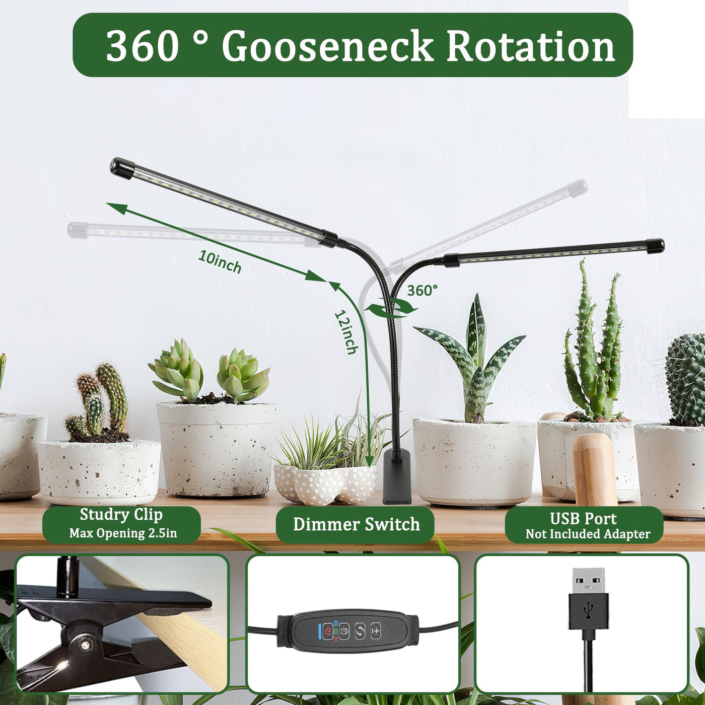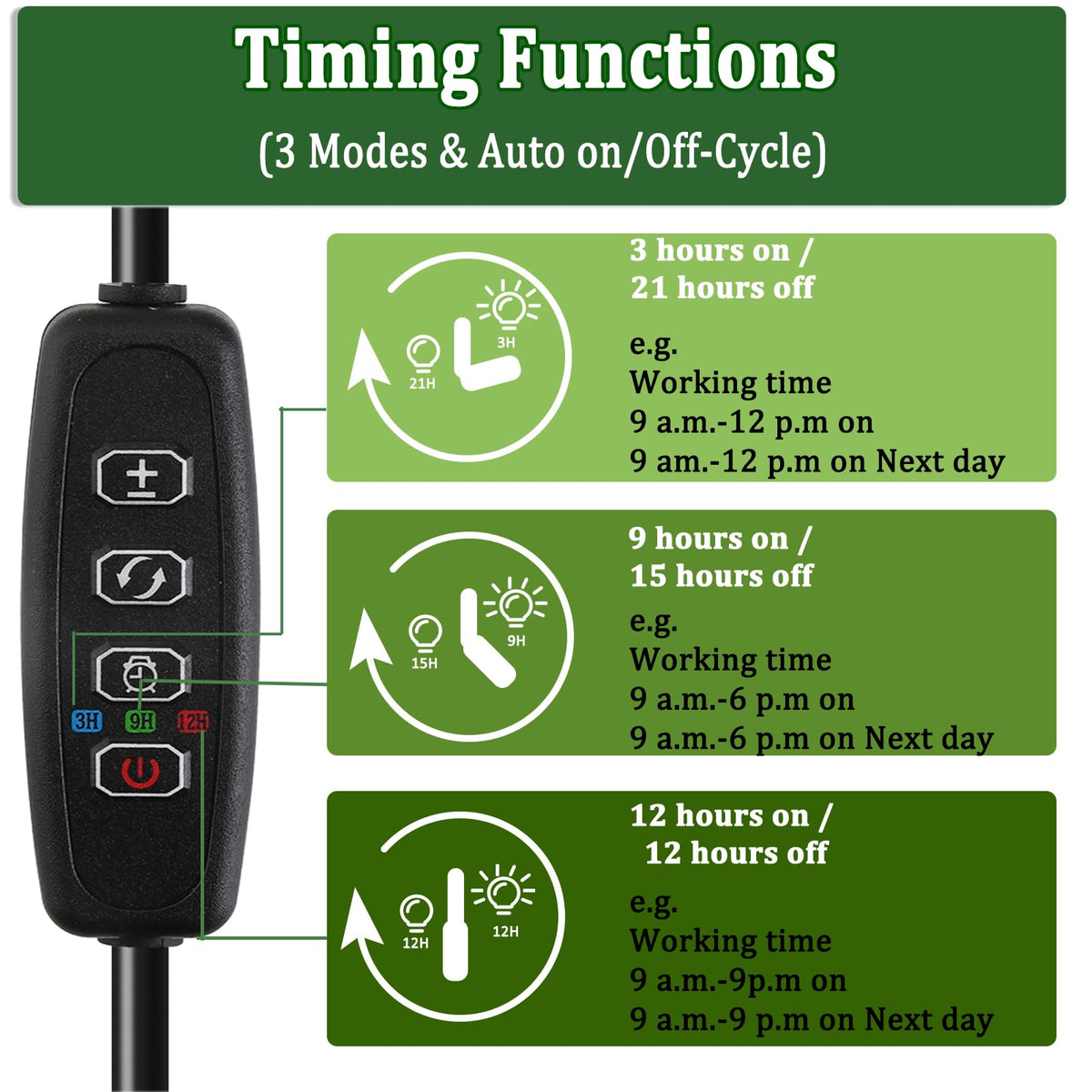 Specifications: Power: 40W LED quantity: Total 40Pcs(13pcs+7pcs) /Each Light Strips Material: Plastic & Metal Neck Height: approx. 12 inch Light strip length: approx. 9.64 inch Suitable for desk thickness: less than 2.5 inch Package Contents: 1 x LED Plant Grow Light (Power adapter NOT included) 1x User Manual [INSTRUCTIONS] 1. Press the power button to turn ON/OFF 2. Press the +/-button to adjust the brightness (9 levels) 3. Press the switch button to select red light, white light or white+red light 4. Press the timing button to set timers. 3/9/12H 5. Please let the lamp rest for a few minutes after lighting for 5 hours. You can fill light 1-3 times a day 6. Stronger metal clip is convenient to help you install it any place you want [How to Set The Timer] 1. A short press to enter the 3H timing function 2. Short press two times to enter the 9H timing function 3. Short press three times to enter the12H timing function 4. Short press four times to cancel the timing function [WARM TIPS] ?User can set it up to turn off automatically after 3H/9H/12H, please keep the POWER always on. ? Give plants enough water and rest time in the dark,they need rest too. ? Keep the lamp away from rain and snow