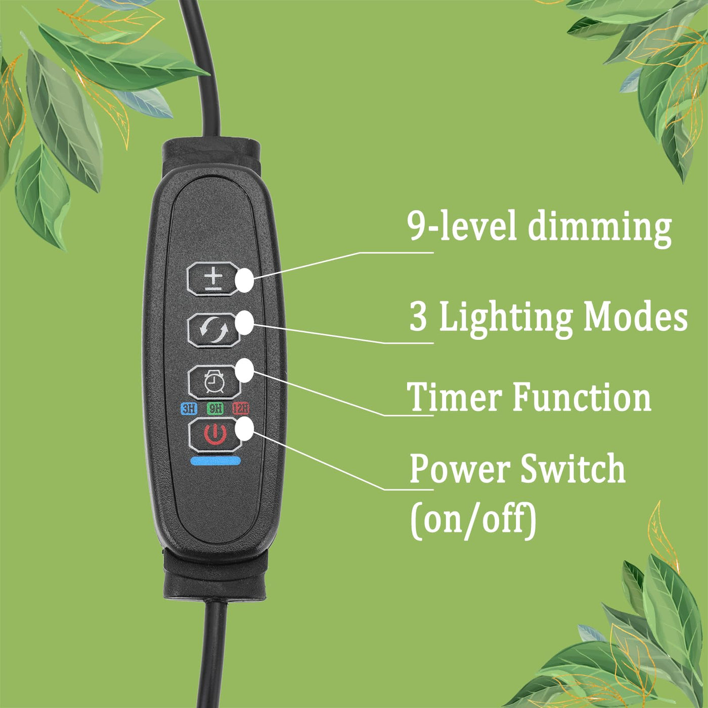 Specifications: Power: 20W LED quantity:20Pcs(13pcs+7pcs) Material: Plastic & Metal Neck Height: approx. 12 inch Light strip length: approx. 9.64 inch Suitable for desk thickness: less than 2.5 inch Package Contents: 2 x LED Plant Grow Light (Power adapter NOT included) 1x User Manual [INSTRUCTIONS] 1.Press the power button to turn ON/OFF 2.Press the +/-button to adjust the brightness (9 levels) 3.Press the switch button to select red light, white light or white+red light 4.Press the timing button to set timers. 3/9/12H 5.Please let the lamp rest for a few minutes after lighting for 5 hours. You can fill light 1-3 times a day 6.Stronger metal clip is convenient to help you install it any place you want [How to Set The Timer] 1. A short press to enter the 3H timing function 2.Short press two times to enter the 9H timing function 3.Short press three times to enter the12H timing function 4. Short press four times to cancel the timing function [WARM TIPS] ?User can set it up to turn off automatically after 3H/9H/12H, please keep the POWER always on. ? Give plants enough water and rest time in the dark,they need rest too. ? Keep the lamp away from rain and snow