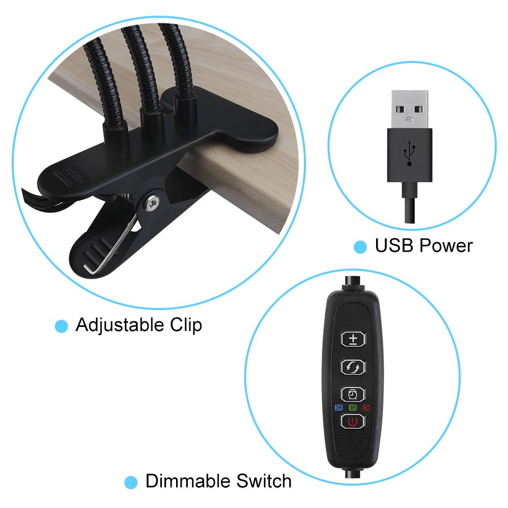 Specifications: Power: 80W LED quantity:80LED Material: Plastic Height: approx. 12 inch Light strip length: approx. 9.64 inch Suitable for desk thickness: less than 2.5 inch Package Contents: 1 x LED Plant Grow Light (Power adapter NOT included) [INSTRUCTIONS] 1.Press the power button to turn ON/OFF 2.Press the circulation button to adjust the brightness (9 levels) 3.Press the switch button to select red light,blue light or red&blue light 4.Press the timing button to set timers. Red means timer of 3 hours, blue 9 hours,red&blue 12 hours. 5.Please let the lamp rest for a few minutes after lighting for 5 hours. You can fill light 1-3 times a day 6.Stronger metal clip is convenient to help you install it any place you want [How to Set The Timer] 1. A short press to enter the 3H timing function,the indicator light flashes once in 5 seconds 2.Short press two times to enter the 9H timing function,the indicator light flashes two times in 5 seconds 3.Short press three times to enter the12H timing function,the indicator light flashes three times in 5 seconds 4. Short press four times to cancel the timing function [WARM TIPS] ?User can set it up to turn off automatically after 3H/9H/12H, please keep the POWER always on. ? Generally this grow light should be turned on for 5 hours one time, 2 times every day. ? Give plants enough water and rest time in the dark,they need rest too. ? Keep the lamp away from rain and snow