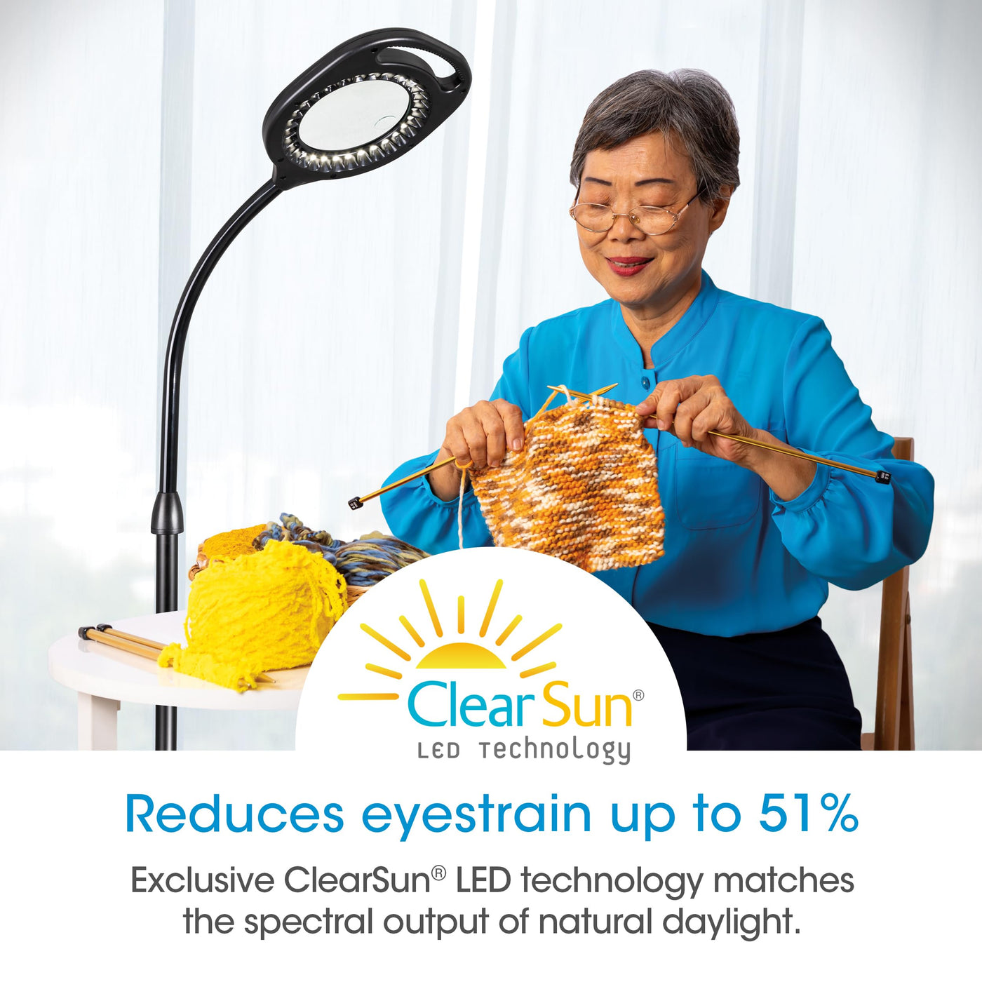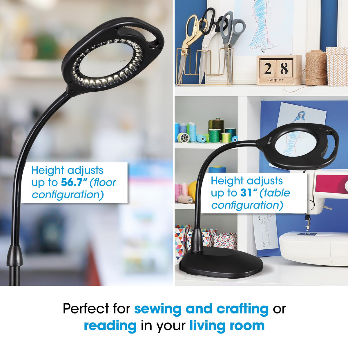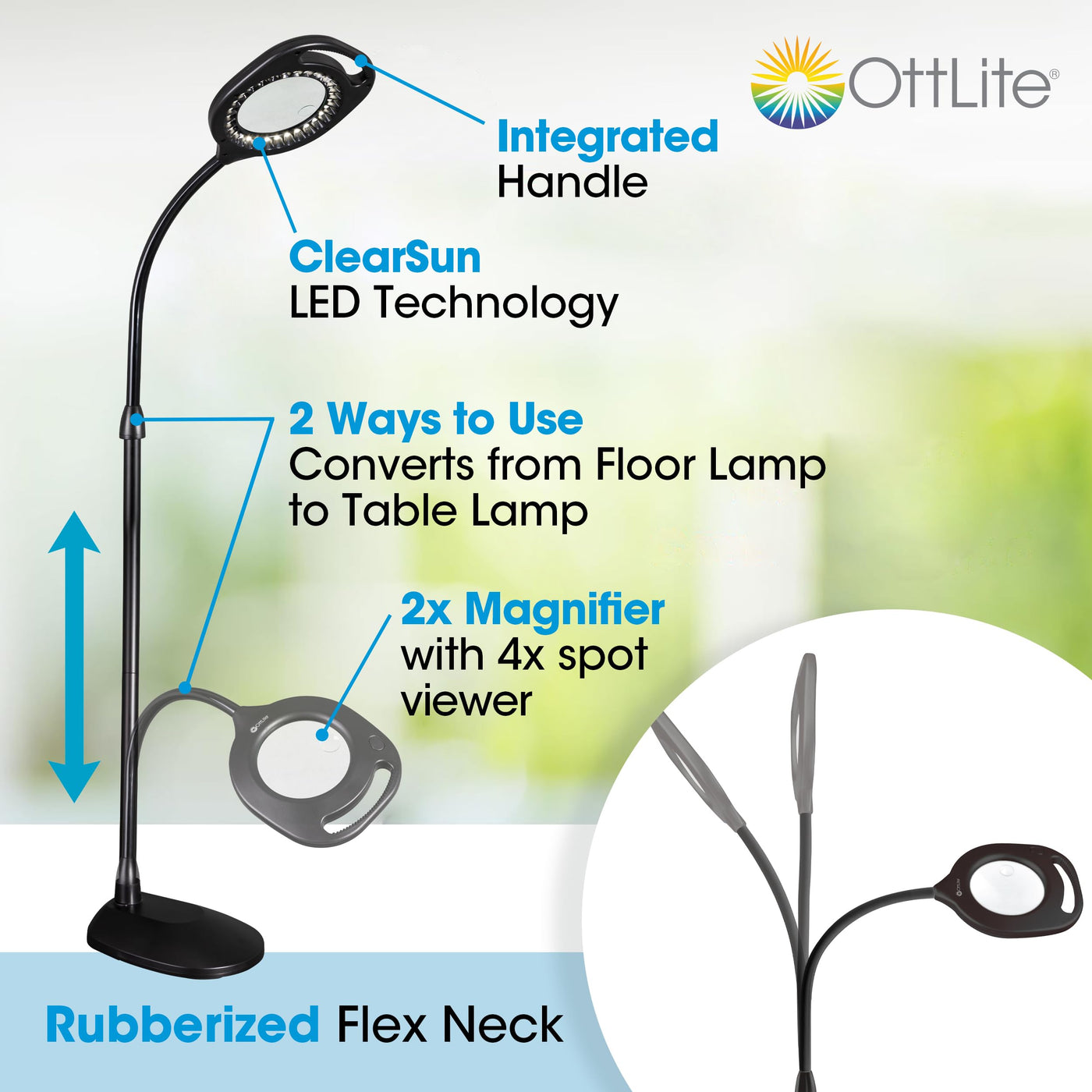 OttLite Clearsun LED illumination combined with two optical grade magnifiers. The 2-in-1 LED Magnifier Floor and Table Light combines OttLites exclusive ClearSun LEDs with optical grade magnifiers and a rugged built-in handle so you have hands-free magnifying light exactly where you need it. Plus, it includes a conversion kit allowing for easy conversion from a floor lamp to a table-top model. Its like having two lamps in one! 5-inch diameter, 2x optical grade magnifier with 4x spot magnifier