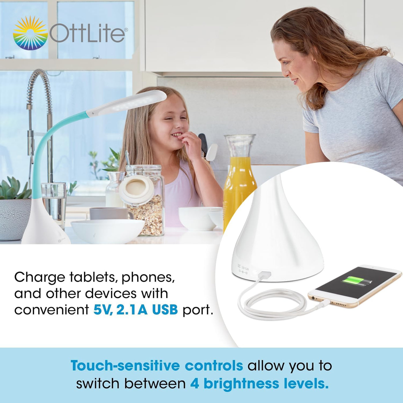 Ottlite Creative Curves Led Desk Lamp W/Usb, Clearsun, White W/Turquoise, Shipper