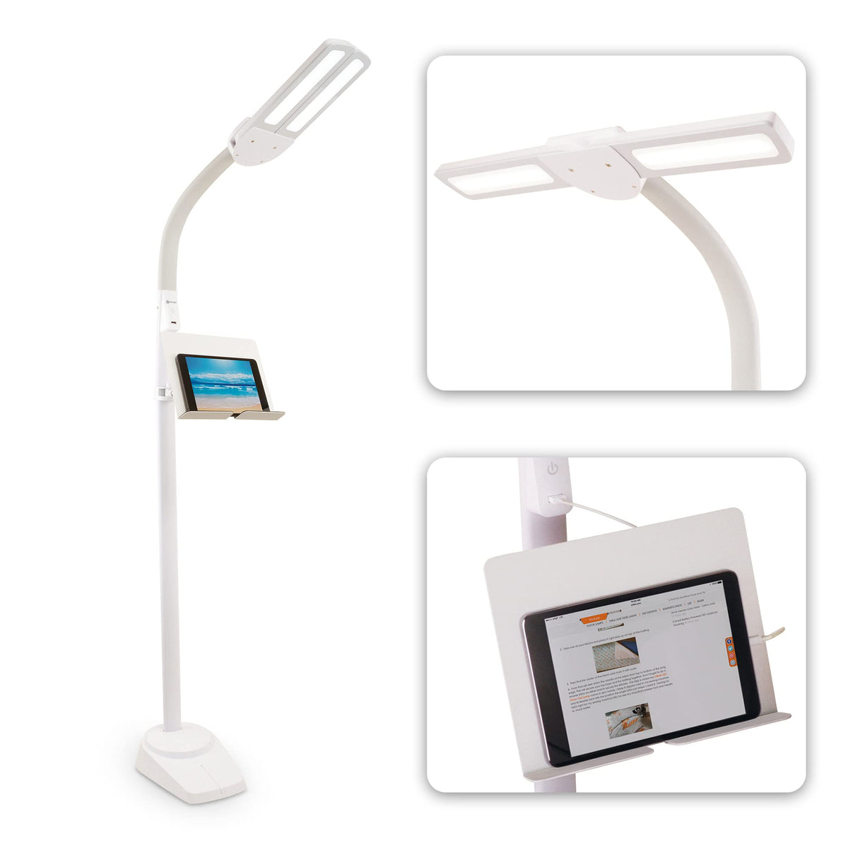 Dual Head Design for More Illumination: See your workspace fully lit with the Dual Shade LED Floor Lamp from OttLite. Perfect for your craft room, workshop, or studio, this adjustable light features four levels of illumination along with dual pivoting shades to provide a wide range of lighting options. A sturdy and flexible neck adjusts to provide light where you need it most. The height adjusts from 52in to 62in. The base measures 8in x 12.44in.