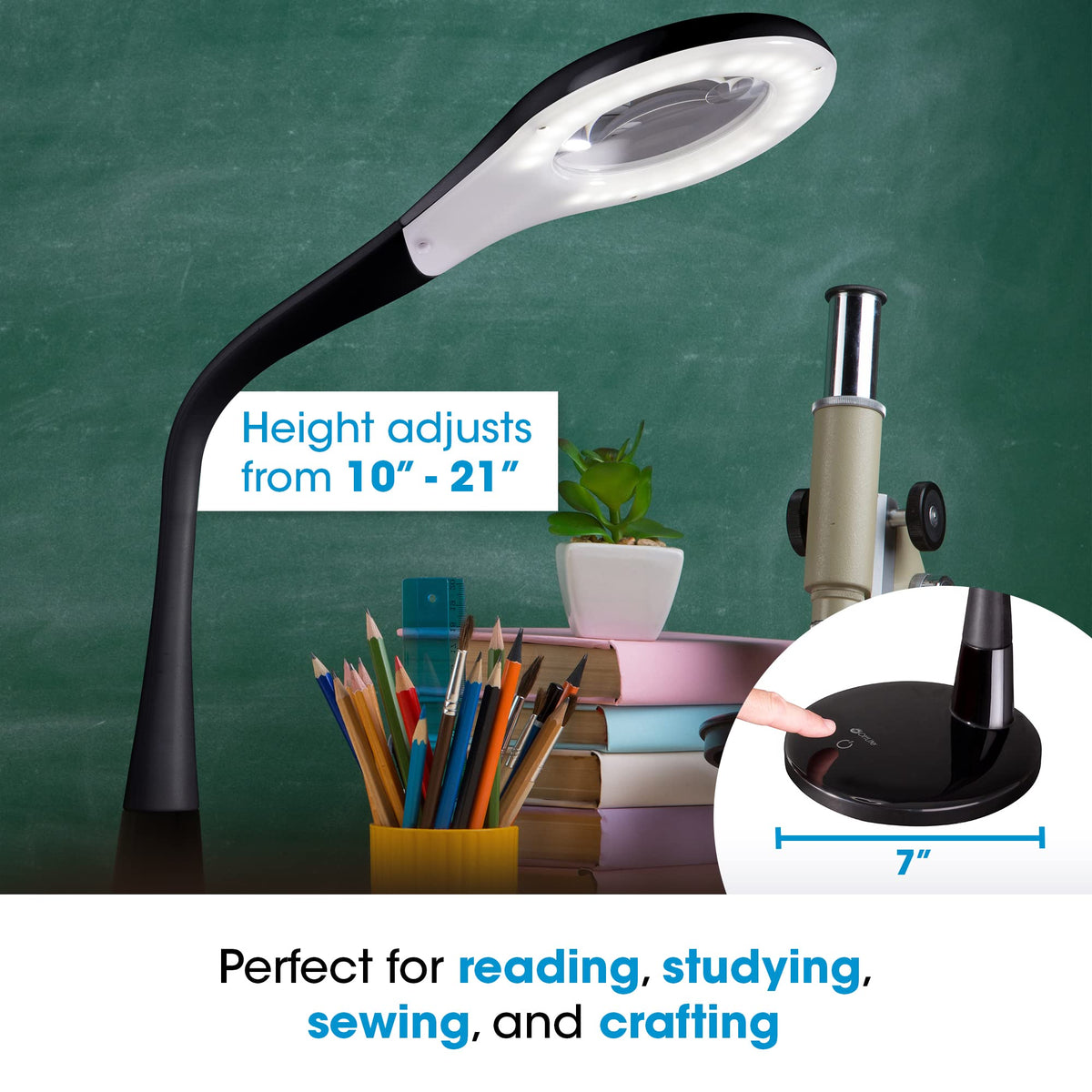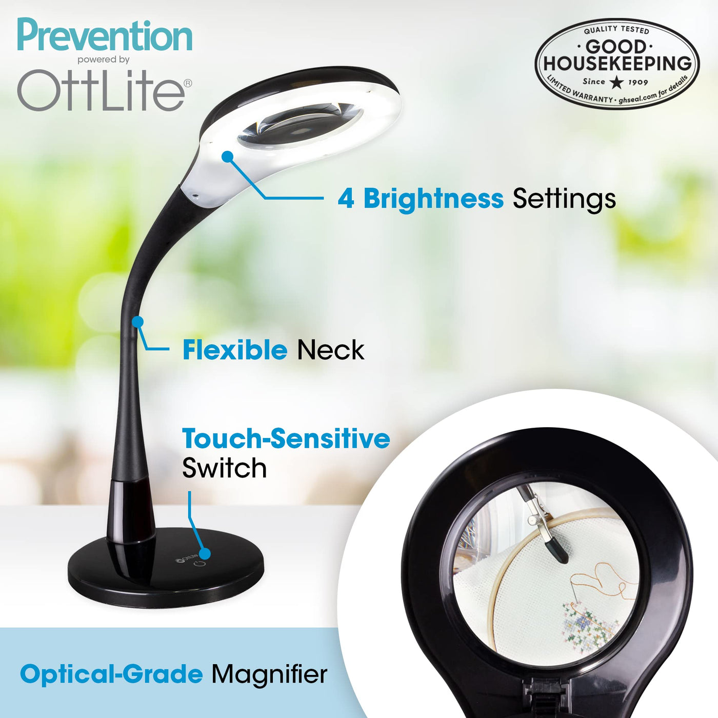 Backed by the Good Housekeeping Seal: Prevention by OttLite LED Magnifier Lamp is great for hours of reading, studying, sewing, and crafting. This lamp is part of a line created with Prevention Magazine and has earned the Good Housekeeping Seal. The flexible, sturdy neck easily adjusts the height from 10 to 21 inches to illuminate and magnify the area you need to see best. The base diameter measures 7 inches.