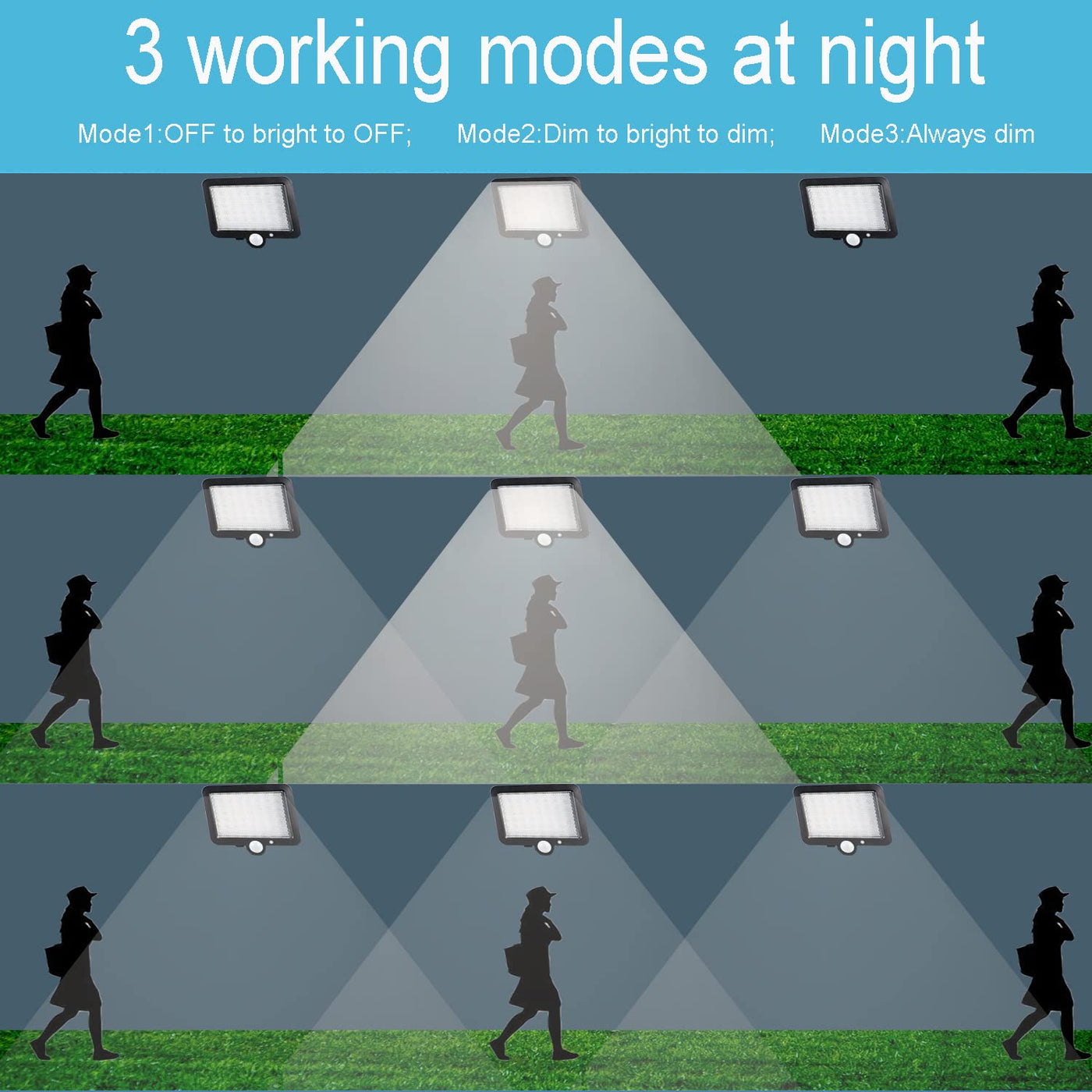 Q: How does the motion sensor work on the Outdoor Solar Lights?A: The Outdoor Solar Lights feature a PIR motion sensor with a 120° sensing angle that detects movement within a range of 3 to 5 meters. The light can be set to different modes, including turning on to high brightness when motion is detected and then turning off after 25 seconds of no movement.