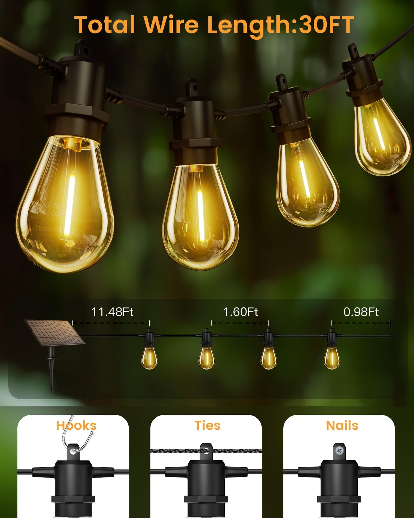 Outdoor Solar String Lights, 30Ft Waterproof S14 Led Patio Lights With 13 Shatterproof Bulbs, Usb Rechargeable, 2200K Warm White