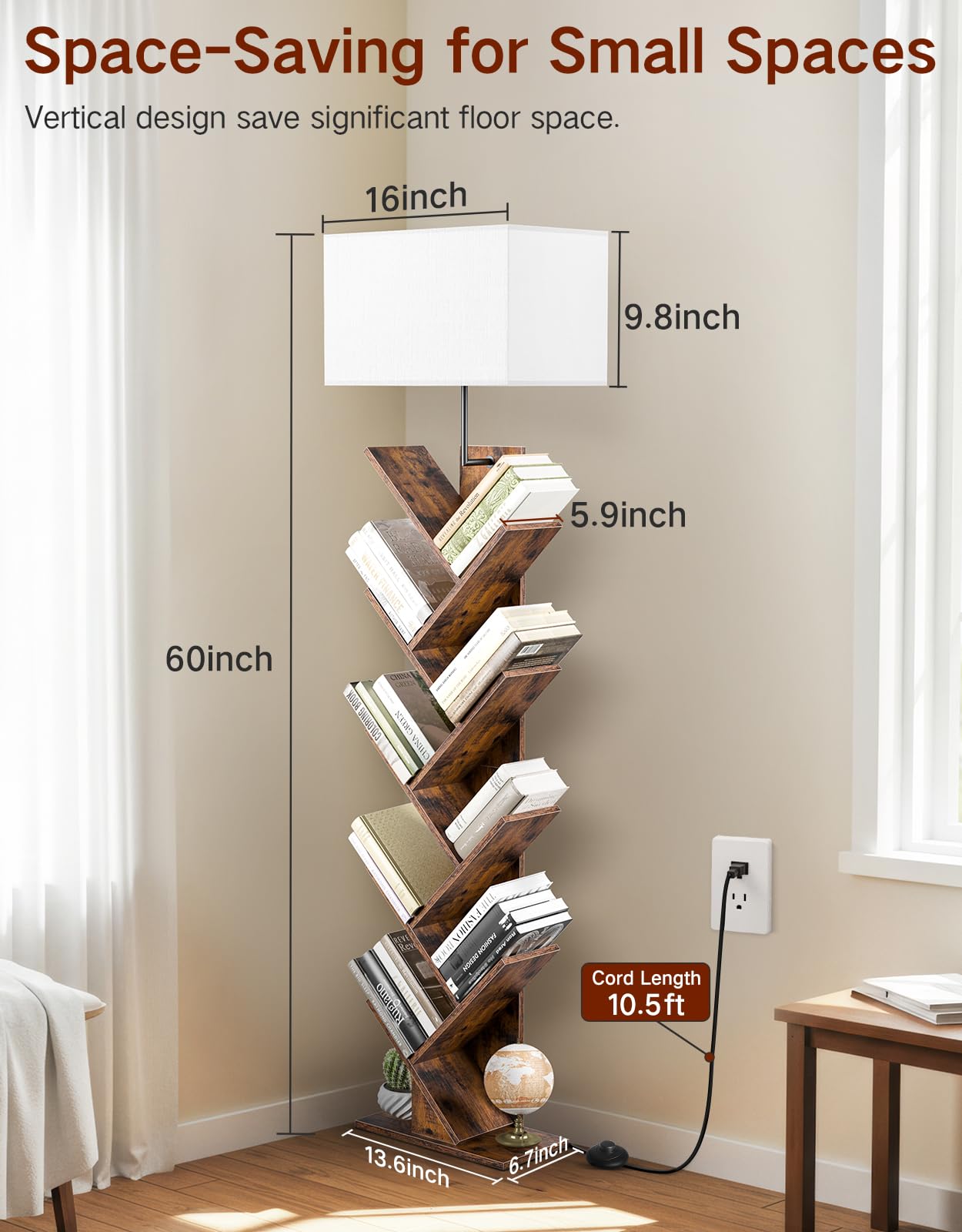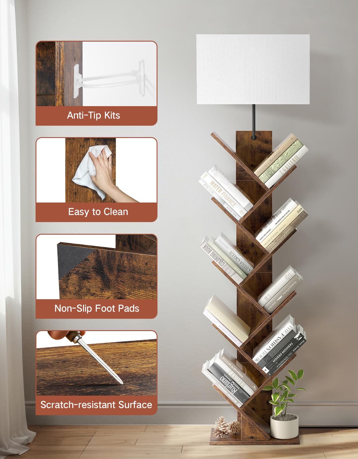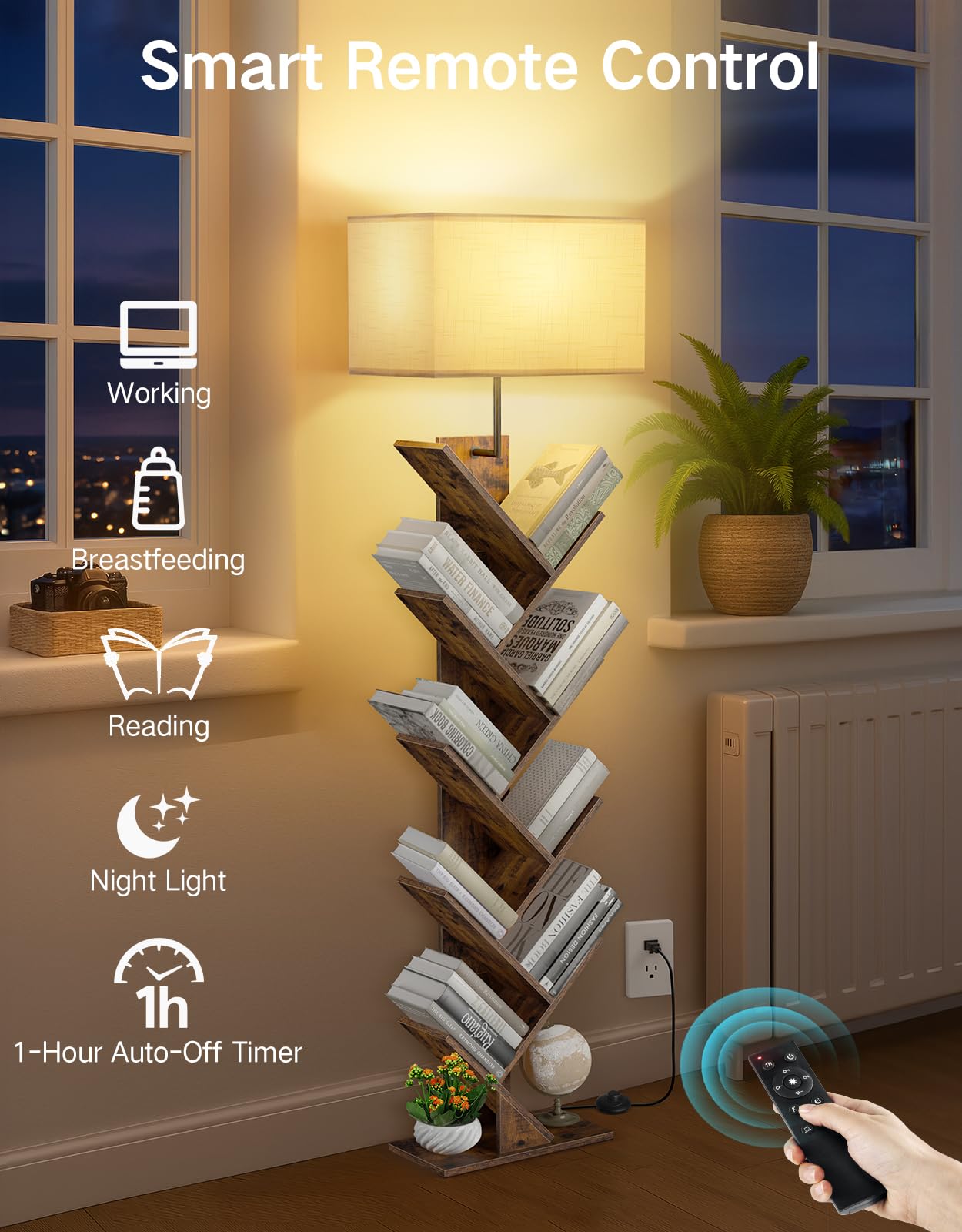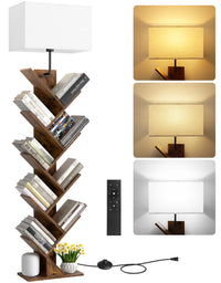 Outonlife 9 Tier Tree Bookshelf With Lamp, Remote & Timer, Modern Tall Floor Standing Book Shelf, Narrow Wood Bookcase, Small Bo