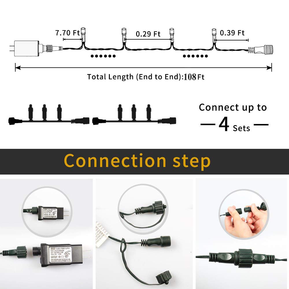 Safty Comes First. 100% Whole Set UL(Underwriter Laboratories Inc.) approved ,CERTIFIED - The whole string lights is completely UL approved (including string wire, LED bulbs and low power consumption output plug), Stay Cool even long time use. including led beads, coppr core insulated wire and power adapter. | PERFECT SIZE AND SUPPORT 4 SETS END TO END CONNECTABLE: 300LEDs 108FT And Support Max 4 Sets End to End Connect. Each one length is 108 feet (99ft first led to last led + 9ft extension cord), Freely 1-4 sets conntect according to your demand. the max expandable length is 432 feet., You Can Buy 4 Sets To Connect Together, Enough To Cover Larger Area. | 8 Lighting Modes and Automatically Memory. Combination, in waves, sequential, slogs ,chasing/flash, slow fade, twinkle/flash and steady on, these 8 Lighting Modes Available for Choice for this LED Christmas String Light and It Remember Your Last Setting Automatically. (Short press the power button to change the working mode of the light string.) | IP55 Heavy Rain And Snow Protection. Withstand any kinds of wet weather, for example heavy rain and snow, This is designed to use for indoor and outdoor. Wedding, Holiday, Christmas, Garden, Yard,Lawn, Fence, Porch, Tree, Roof, Deck, patio outdoor use. Perfect string christmas lights. | Perfect Decoration. The light create romantic and warm atmosphere when the lights on.Perfect for indoor and outdoor decorations. party,Valentine's Day, wedding, home, window,festival, restaurant, hotel,commercial building, shopping center etc. If you have any questions about the products, please contact us in time.