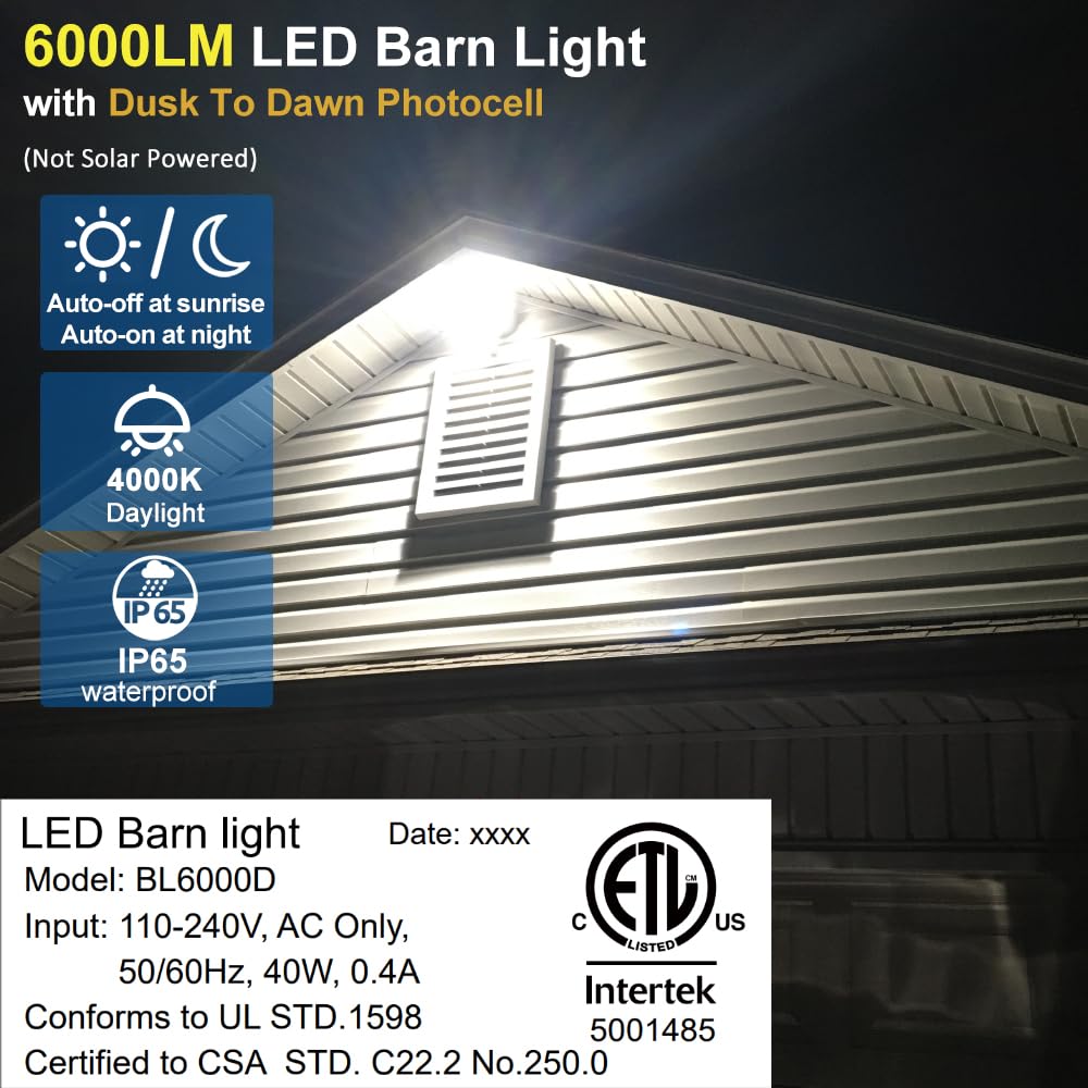 - **Automatic Dusk to Dawn Functionality**: Equipped with a sensitive photocell sensor, the Owleye barn light automatically turns on at sunset and off at sunrise, providing hassle-free operation while significantly reducing energy consumption.