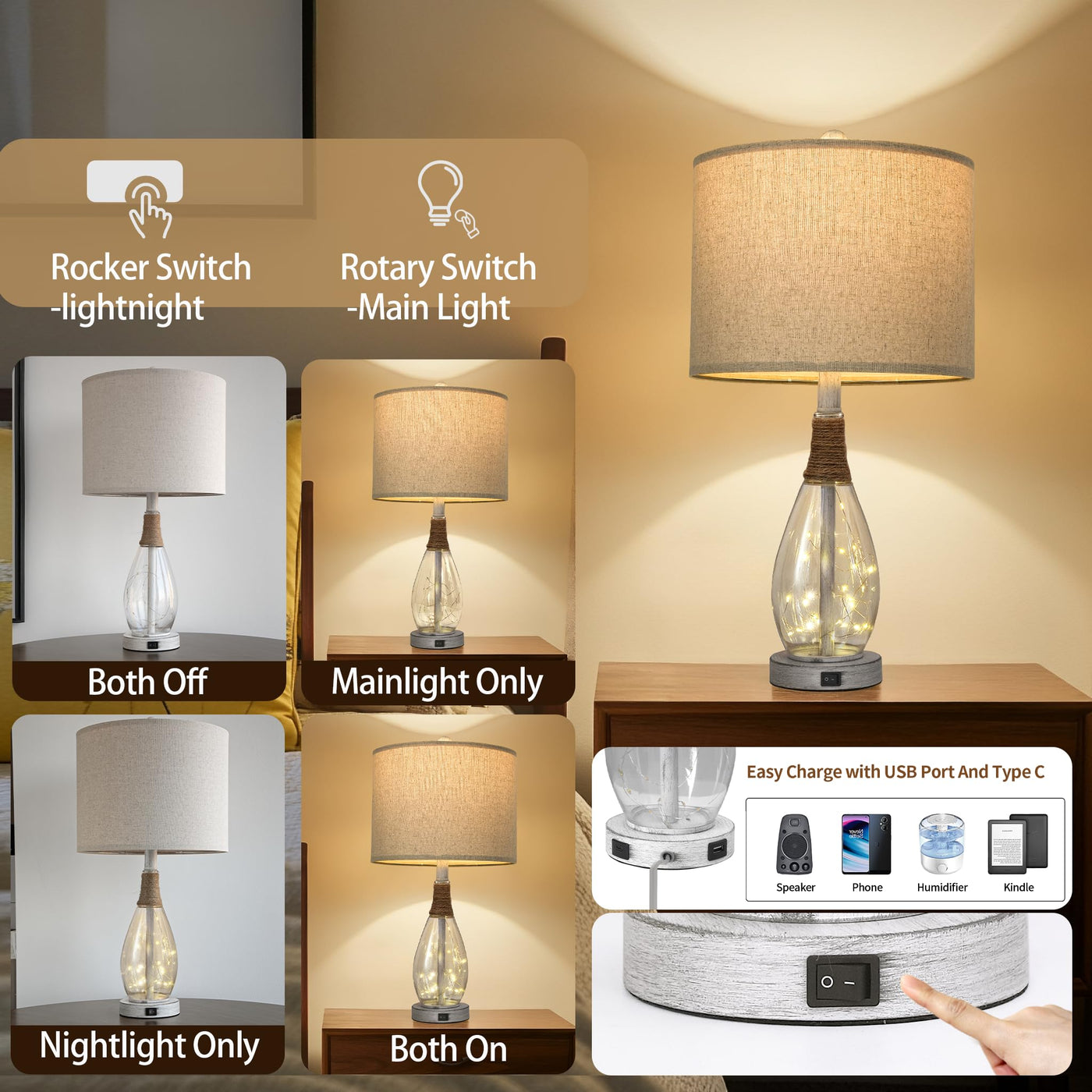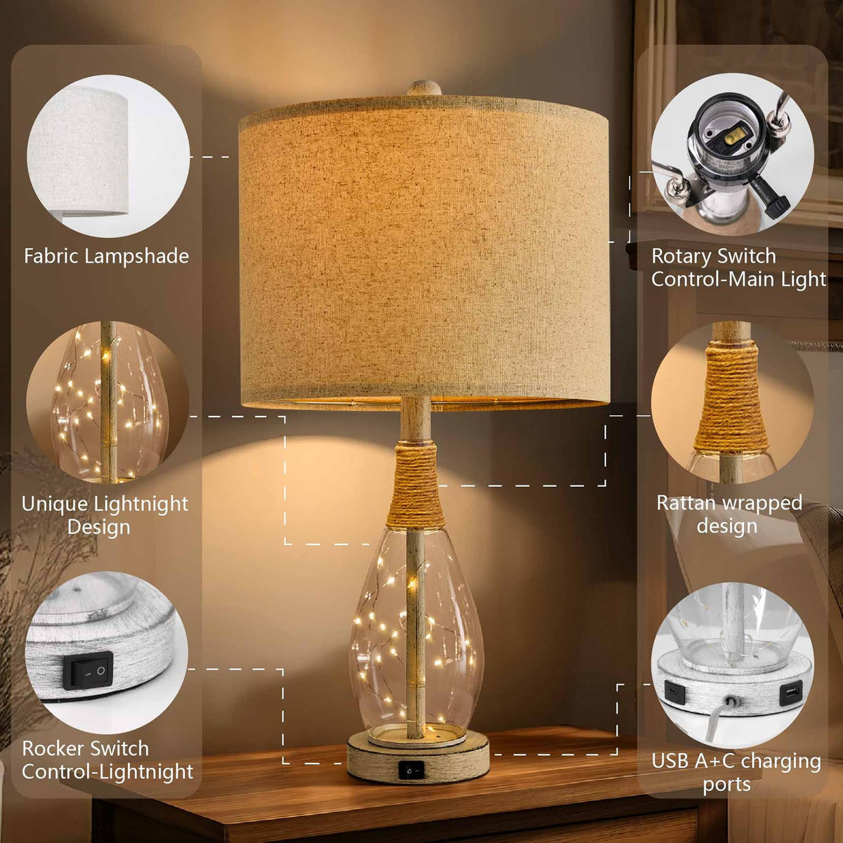 Q: What are the main features of the OYEARS 23" USB A+C Table Lamp?A: The OYEARS 23" USB A+C Table Lamp features two points of light: a bulb and a base light inside a glass jar, creating a warm and cozy atmosphere. It includes USB A+C charging ports for convenient device charging, making it functional for bedside use. The lamp is designed with a unique rattan glass body and linen fabric lampshade that adds a romantic touch to any living space.