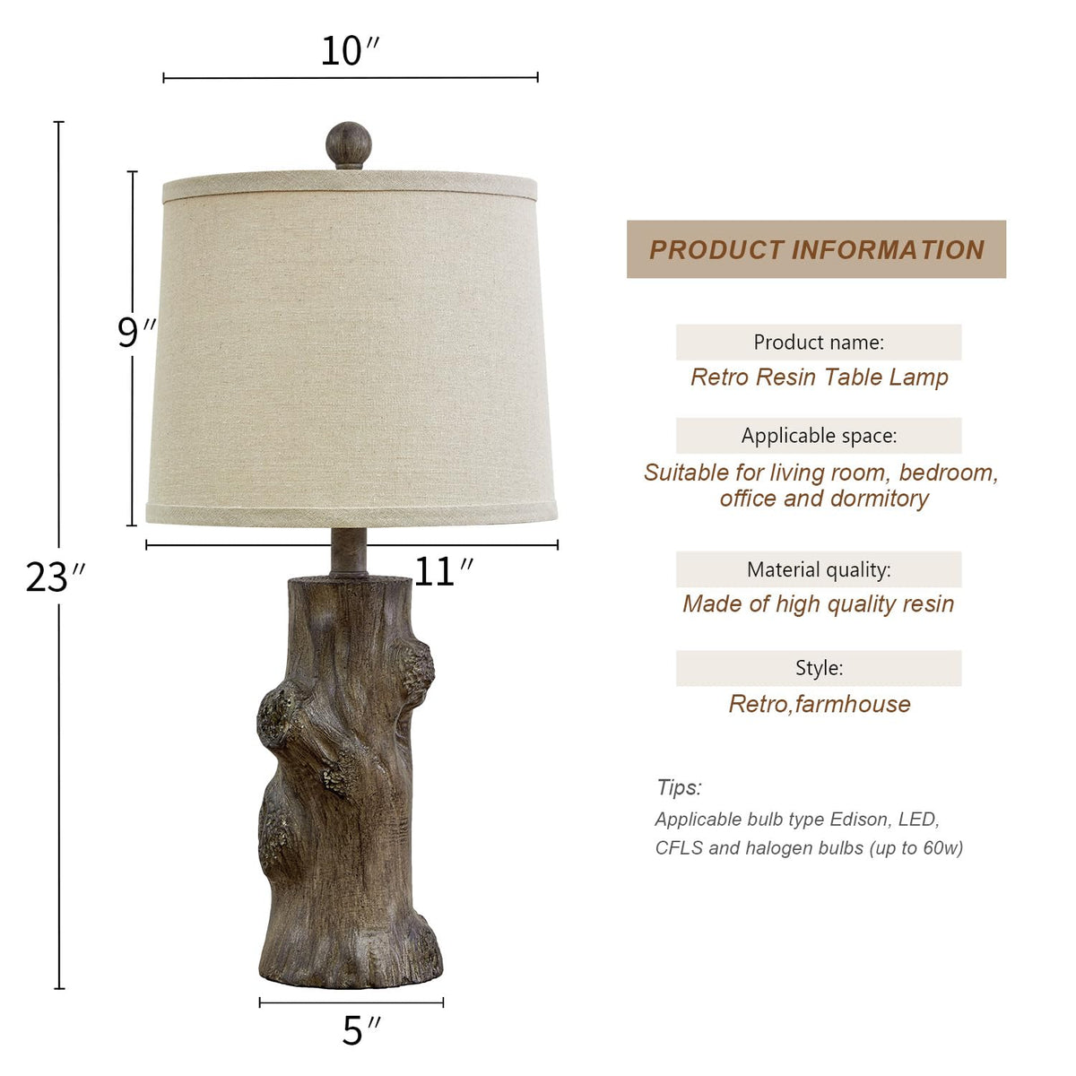 Oyears 23''Resin Table Lamps For Living Room Set Of 2 Country Cottage Farmhouse Lamp For Bedroom Tree Trunk Wood Grain With Oatmeal Fabric Round Shade Vintage Rustic Traditional Nightstand Bedside Lamp