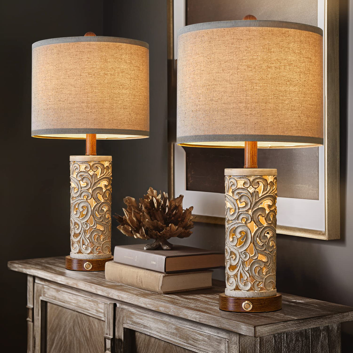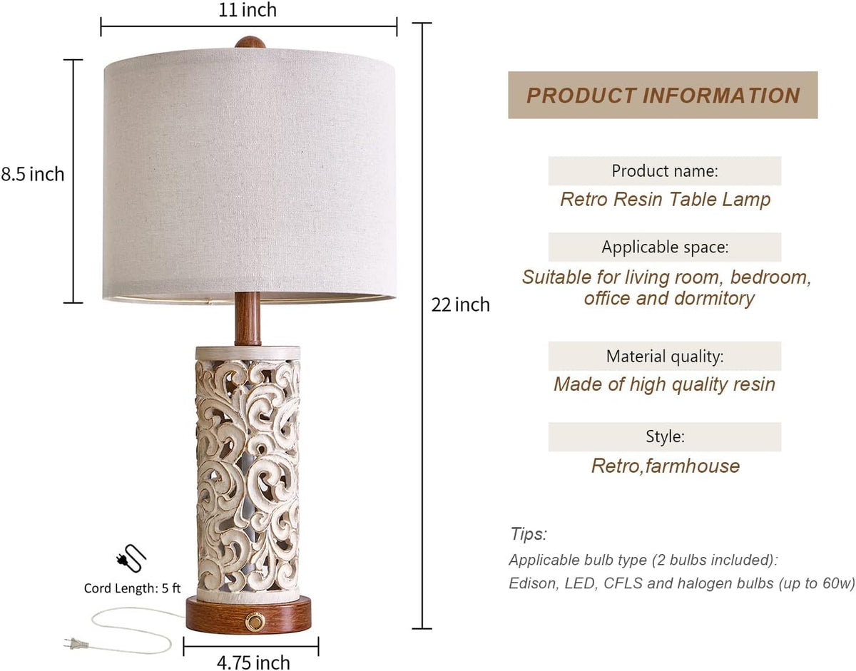 Oyears 3-Way Dimmable 22'' Usb A+C Touch Control Table Lamp Set Of 2 With Nightlight For Living Room Bedroom Farmhouse Bedside N