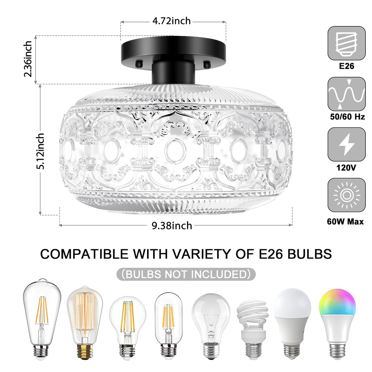 Q: What type of bulbs are compatible with the OYKYOHEI Semi Flush Mount Ceiling Light?A: The OYKYOHEI Semi Flush Mount Ceiling Light requires E26 base bulbs, which include incandescent, LED, CFL, and halogen options. Please note that the bulbs are not included with the fixture and the maximum wattage allowed is 60W.