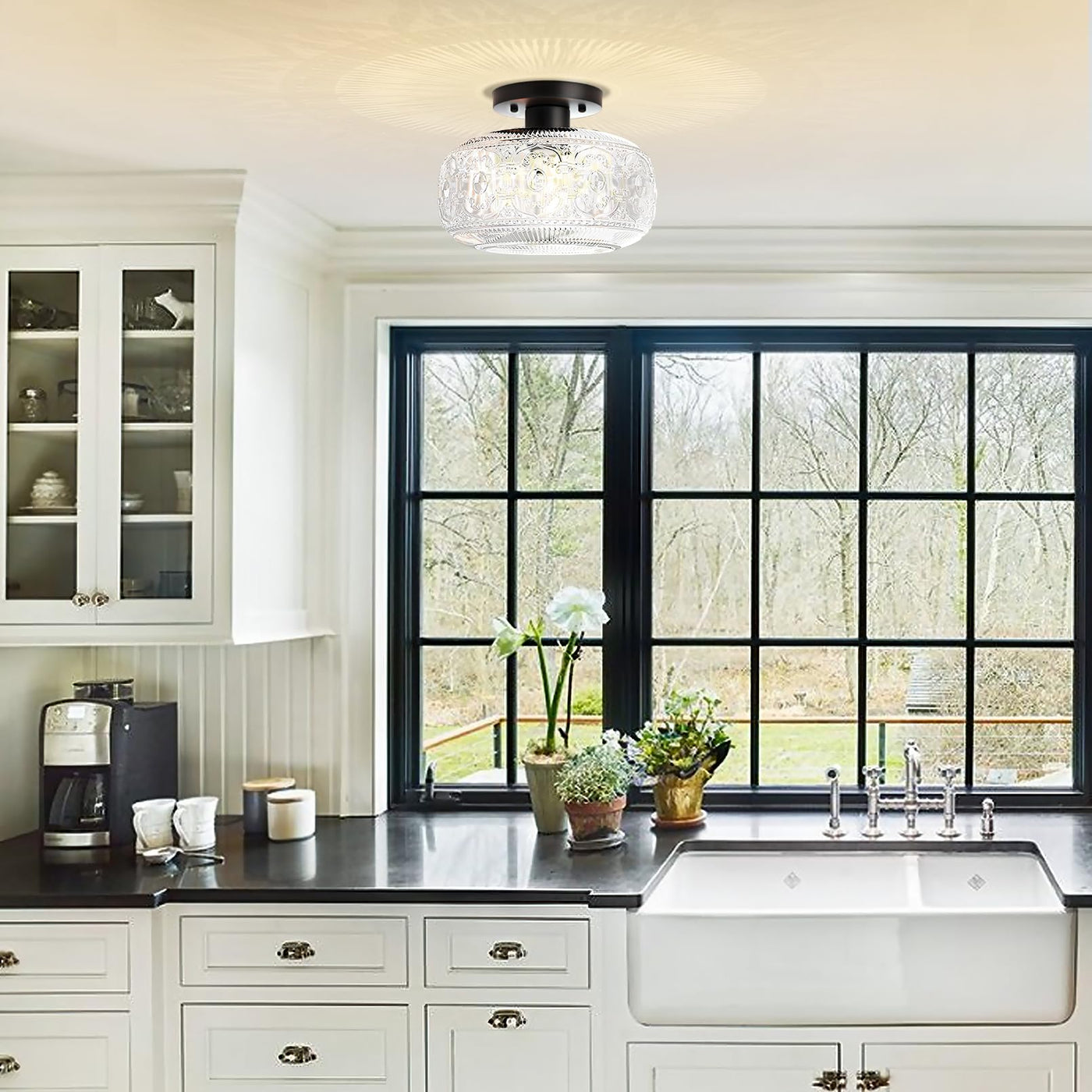 Q: What decor styles does this ceiling light suit?A: This ceiling light fixture beautifully complements a variety of decor styles, particularly vintage farmhouse and industrial aesthetics. Its matte black base and crystal glass design allow it to blend seamlessly into entryways, bathrooms, bedrooms, and kitchens, enhancing both modern and rustic interiors.