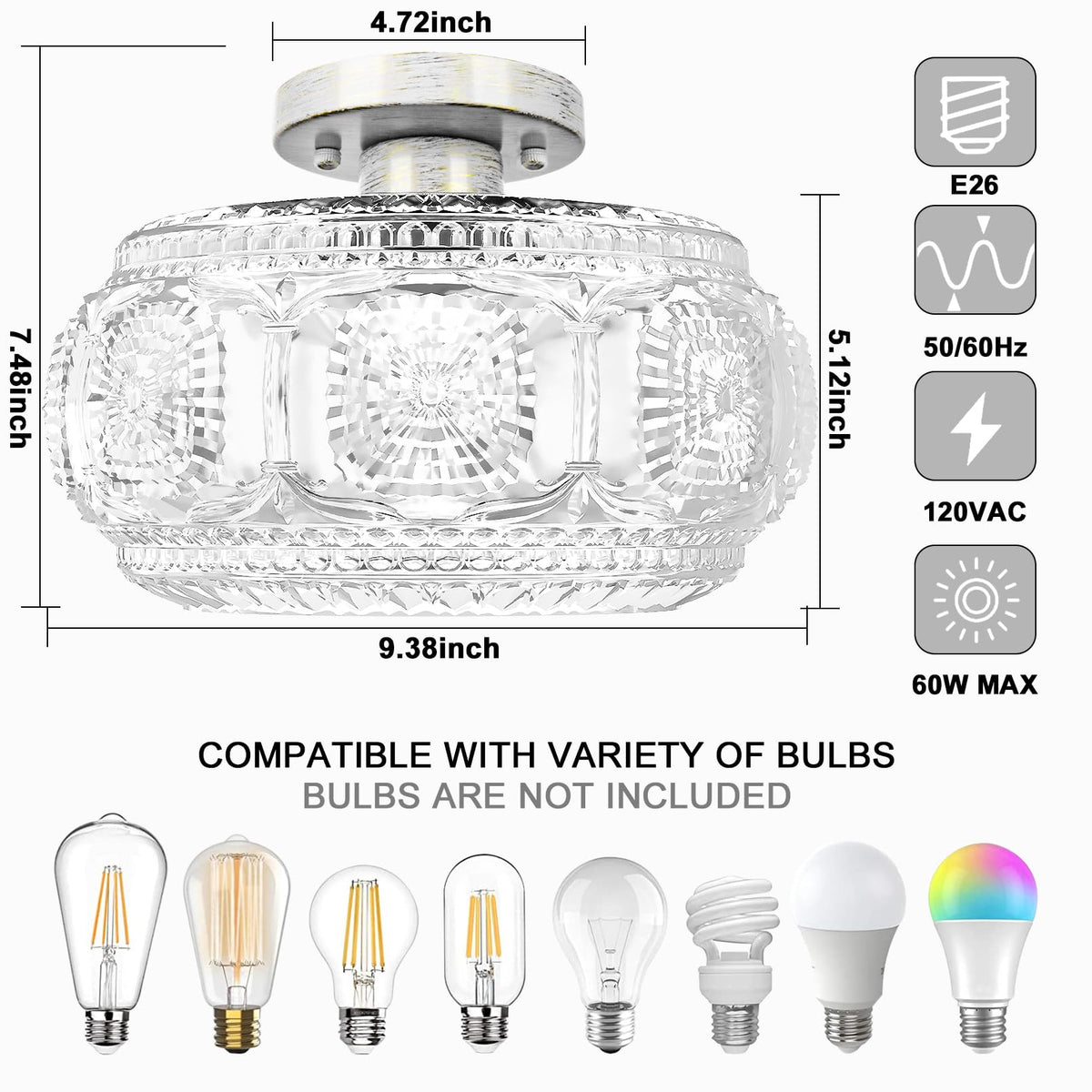 Q: What type of bulbs are compatible with the OYKYOHEI Semi Flush Mount Ceiling Light?A: The OYKYOHEI Semi Flush Mount Ceiling Light requires E26 base bulbs, which are not included in the package. You can use incandescent, LED, CFL, or halogen bulbs with a maximum wattage of 60w.