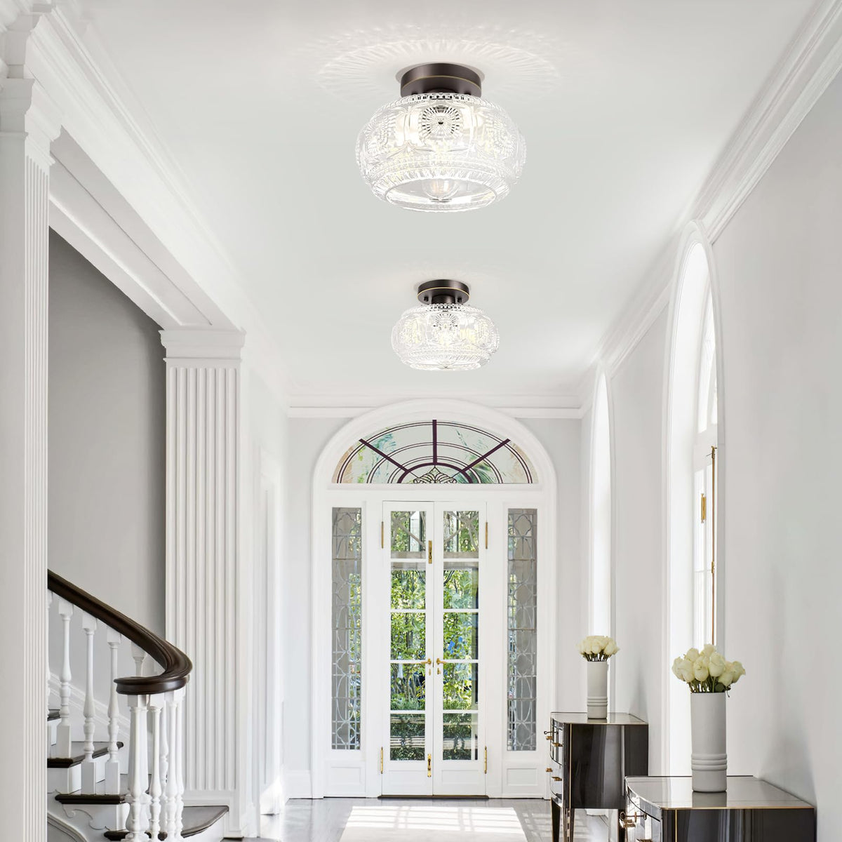Q: What materials are used in the construction of the OYKYOHEI Semi Flush Mount Ceiling Light?A: The OYKYOHEI ceiling light fixture is crafted with a quality glass shade and a durable metal base, ensuring long-lasting use and providing both vintage and modern decor options.