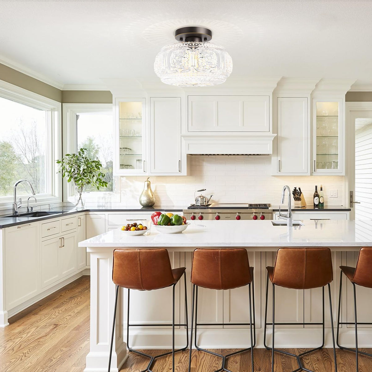 Q: What materials are used in the construction of this ceiling light?A: The OYKYOHEI Semi Flush Mount Ceiling Light is constructed with a quality glass shade and a durable metal base, ensuring longevity and style for both vintage and modern decor.