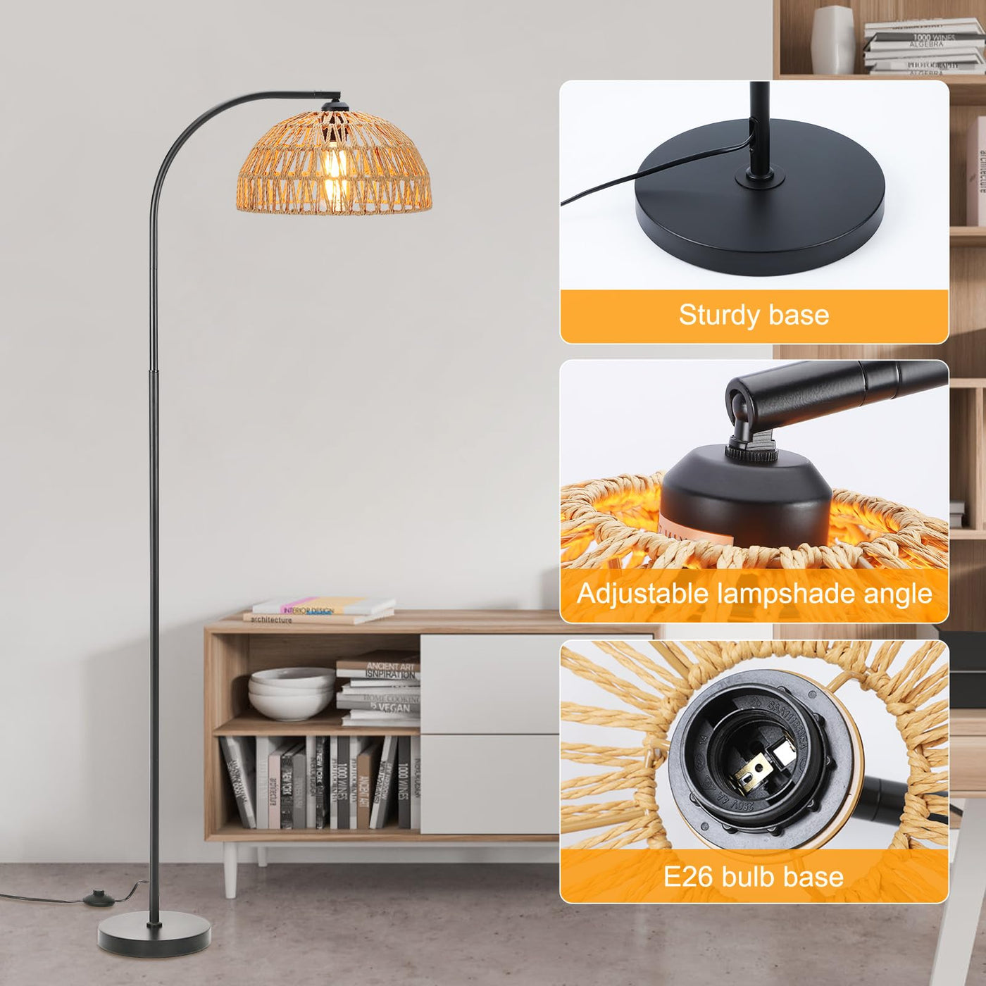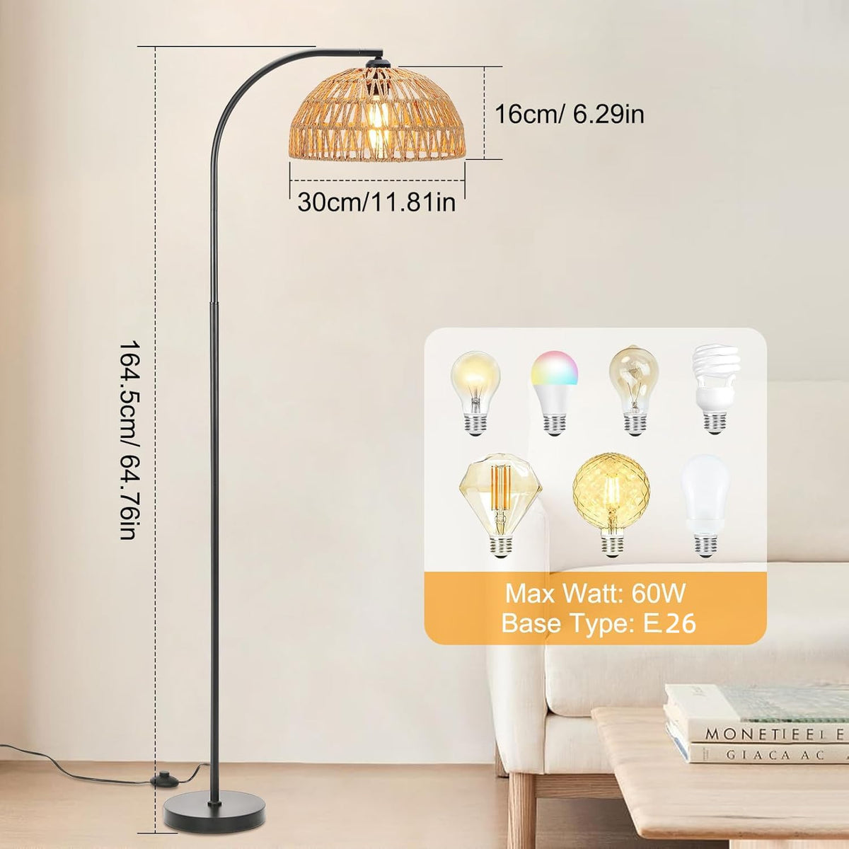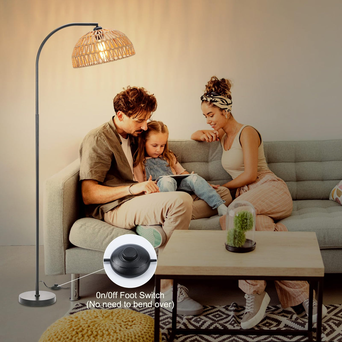 Oyxon Arc Floor Lamp for Living Room Farmhouse 65'' Tall Floor Lamp with ON/Off Foot Switch, Bedroom Rustic Black Standing Lamp, Adjustable Rattan Lamp Shade Boho Floor Lamps, Over Couch Reading Lamp