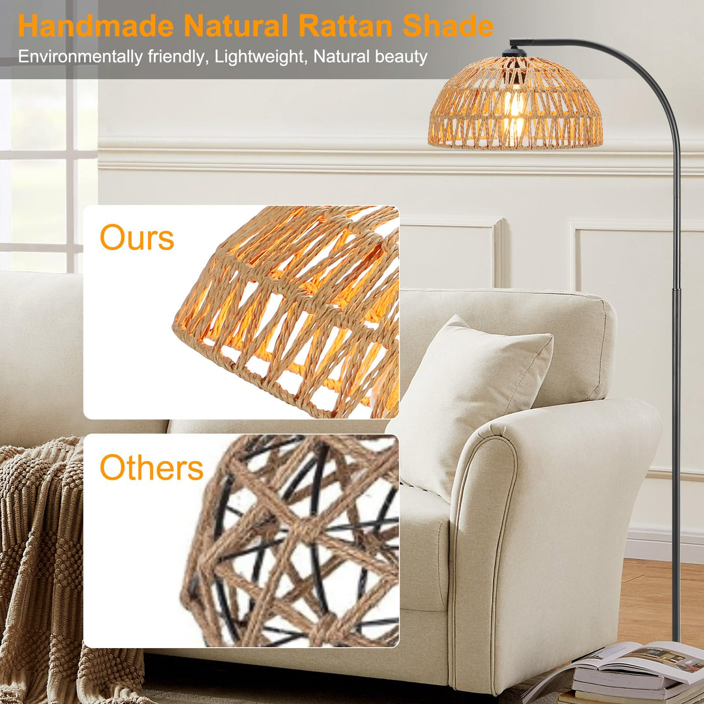 Oyxon Boho Arc Floor Lamp For Living Room With Rattan Lampshade, 65In Farmhouse Vintage Tall Lamp With Foot Switch, Bohemian Sta