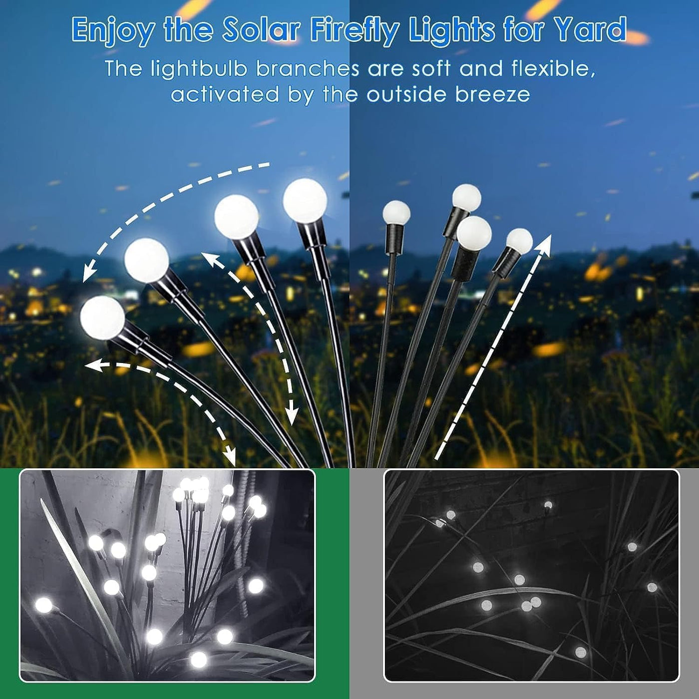 Q: What makes these lights unique for garden decoration?A: These lights feature 8 larger and brighter beads that sway with the wind, mimicking the appearance of fireflies. This unique design enhances the ambiance of any garden, flower bed, or outdoor space, creating a lively atmosphere.