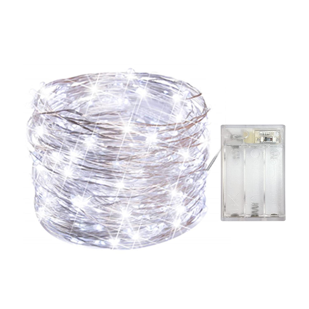 Pack 2 Battery Operated Mini Led String Lights with Timer 6Hours on/18hours off for Wedding Centerpiece Christmas Party Lighting Decorations,50 Count Leds 18 Feet Silver Wire Specifications: Length: 18 Feet Qty: 50 LEDs Color:Silver wire+white Power supply:3*AA battery Function Button: TIMER/ON/OFF; Timer function,6 hours on and 18 hours off per day Package content: 2 set Mini led lights string with Battery box(3AA batteries not included) Mini warm white Led Fairy lights,perfect decoration for wedding centerpieces,Christmas party,and can be easily wear into floral arrangement warpped around branched. Great lights. Quick to install anywhere you want accent lighting Loved the lights. Nice and bright. Worked great on the 18" tree decoration. Timer is great and handy, Lasts long with good batteries,Love these magical lights. Happy buying,order now!
