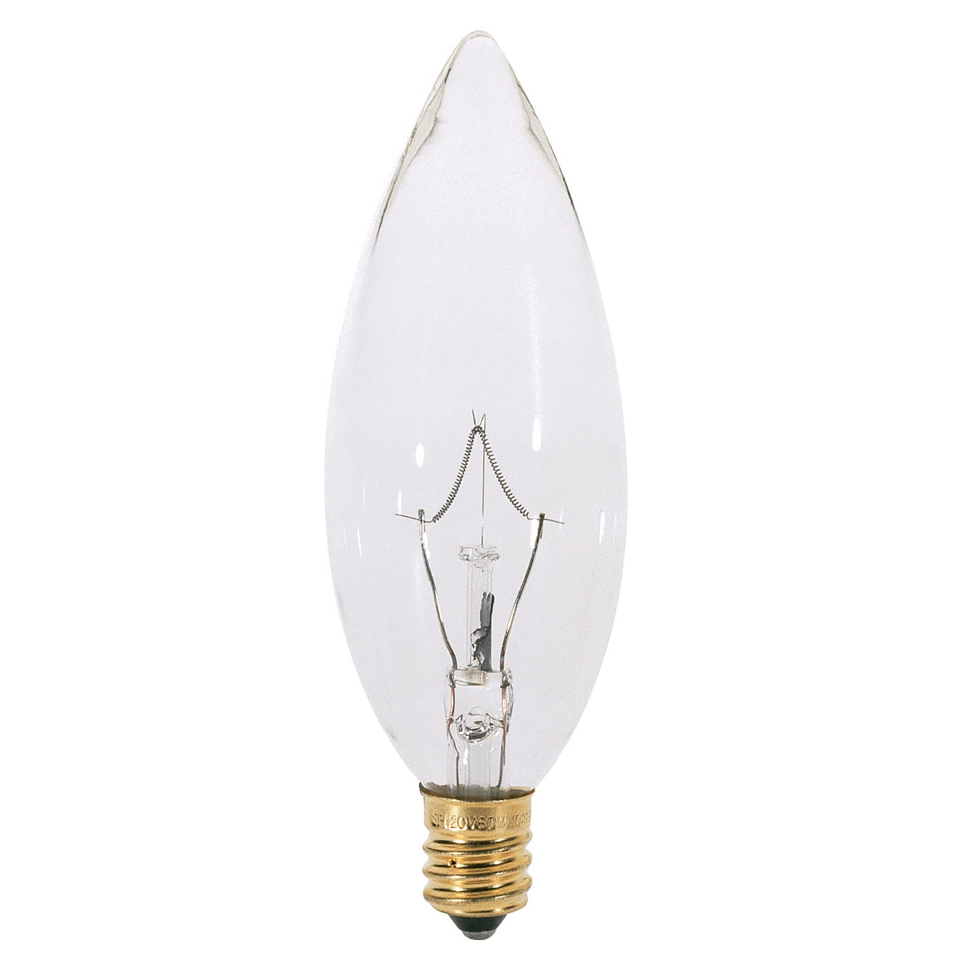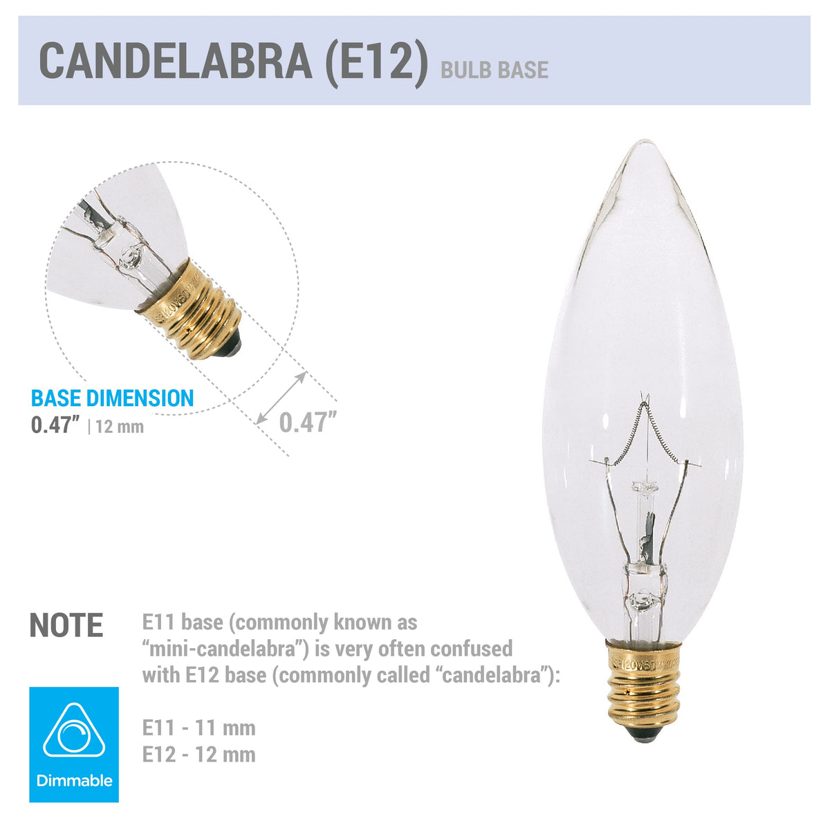 (Pack of 12) 25 Watt CTC Clear Candelabra Base (E12) Straight Torpedo Tip 120V Incandescent Chandelier Light Bulbs This Pack Of 12 Incandescent Decorative Chandelier light bulbs are 25 watts with a torpedo shaped straight tip and crystal clear finish. The average rated lifetime is 1500 hours. They produce around 210 lumens, have a candelabra (E12) base (Which is 12mm in diameter) and will work with a dimmer. They are ideally used in Chandeliers, ceiling fixtures, portables, vanities, and sconces, as well as other household lighting fixtures or fans. The basic design of the incandescent lamp has not changed much since the late 1800s, when Thomas Alva Edison successfully produced the first operational electric light bulb. The filament inside an incandescent lamp must be protected so that oxygen does not reach it and cause it to evaporate on contact. Most incandescent lamps are either vacuum-sealed or gas-filled. Incandescent lamp filaments are made of tungsten. Tungsten is a metal that can operate at very high temperatures without evaporating too quickly and resulting in early lamp failure. Incandescent filaments only convert about 10-Percent of the energy used into visible light, so it is necessary to use a material that can withstand extremely high temperatures. Most lamps use a coiled filament design, which has been found to be stronger and deliver better performance. Pack Of 12 Bulbs