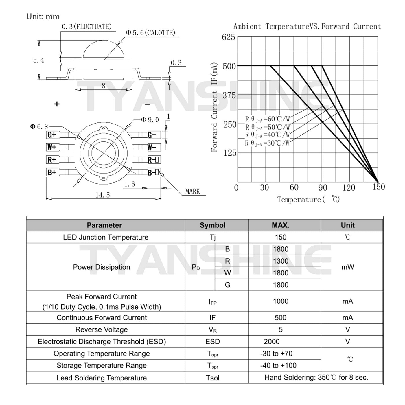 ? Led Chip Brand: TYANSHINE Color: RGBW 4in1 Power: 12w Forward Voltage/Forward Current: DC (R: 2.0-2.6V/500mA, G: 3.0-3.6V/500mA, B: 3.0-3.6V/500mA, W: 3.0-3.6V/500mA) | ? Colour Temperature/Luminous Flux/Power Dissipation: R: 618-625nm/70-95LM/1300MA, G: 518-530nm/130-160LM/ 1800MW, B: 457-463nm/25-35LM/1800MW W: 5500-7500K/145-180LM/1800MW | ? Viewing Angle: 140 degree Storage Temperature: 25? Operation Temperature: -30 to +70? Service life: 50000h Diameter: f9.05mm | ? High-brightness chip/double gold wire/copper frame, It is best to use 3525# lens (diameter 35mm, 25 degree) to work with it. | ? You can make Lighting fixtures DIY use this led beads, or use it to replace the same bad beads, it is used for 12w pinspot light, 9pcs*12w, 18pcs*12w, 24pcs*12w, 36pcs*12w led par light or 12*12w, 18*12w, 24*12w led bar wash wall light, or 12*12w, 36*12w led moving wash light.