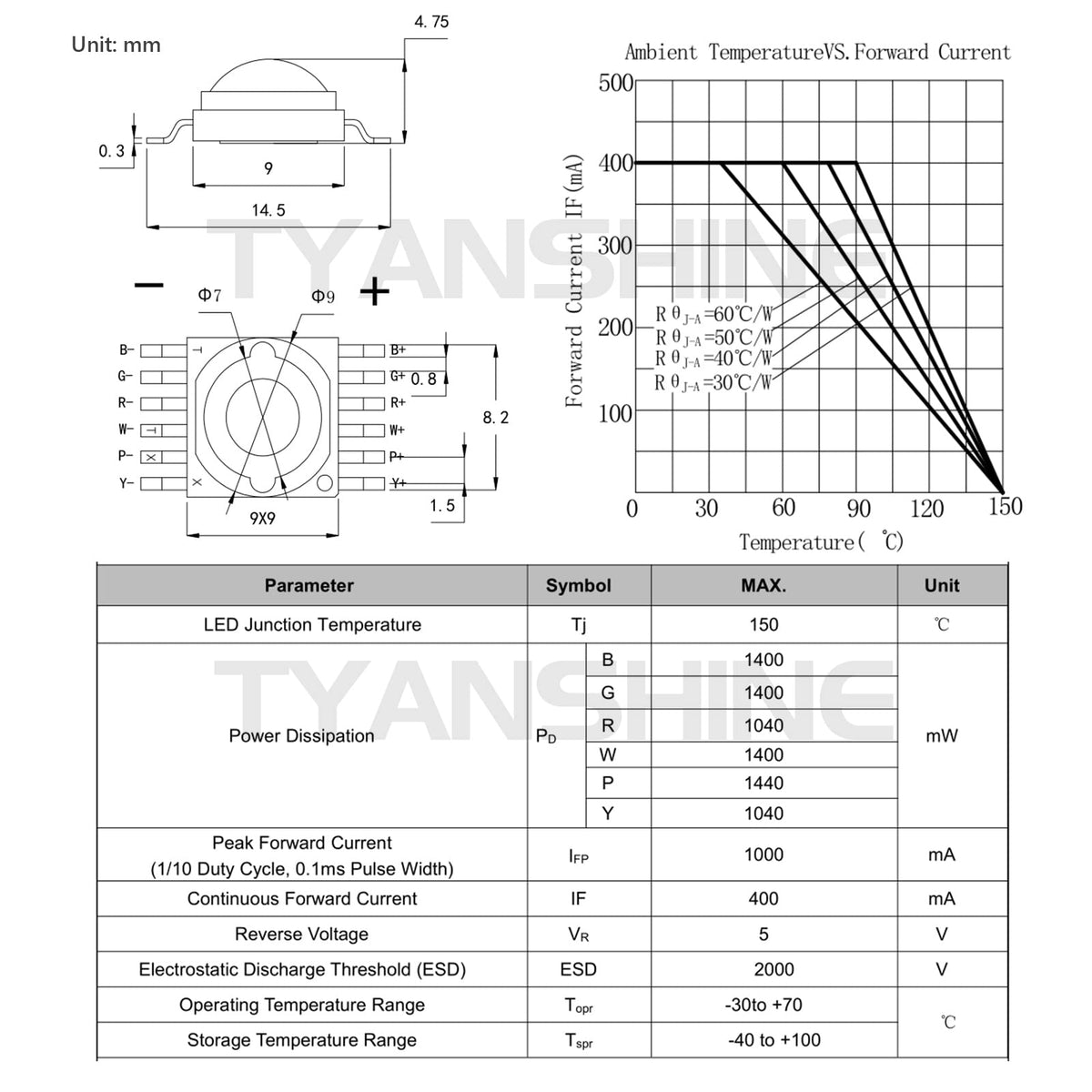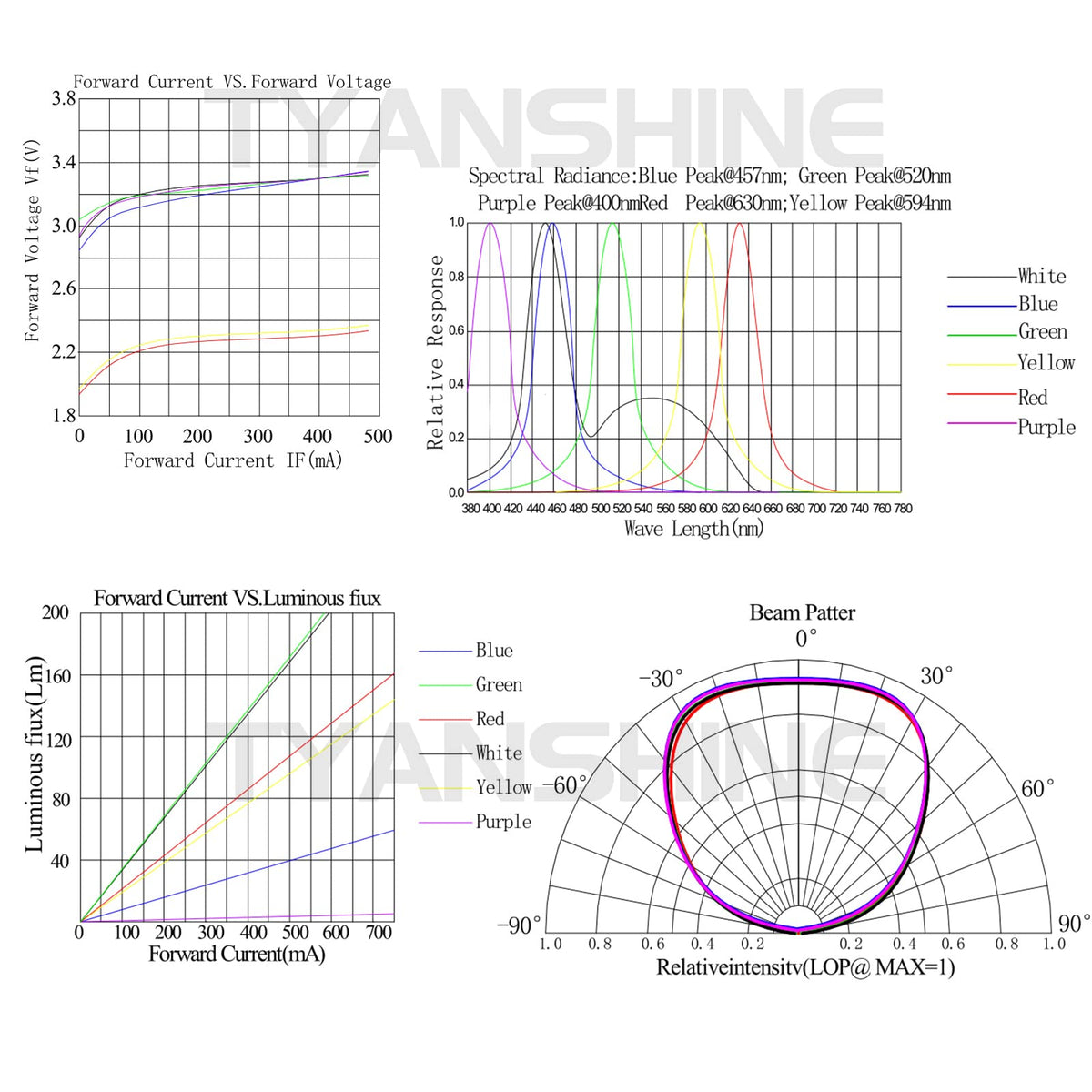 ? Led Chip Brand: Tyanshine Color: Rgbwpy 6In1 Power: 15W Forward Voltage/Forward Current: Dc (R: 2.0-2.6V/400Ma, G:2.9-3.5V/400Ma, B:2.9-3.5V/400Ma, W:2.9-3.5V/400Ma, P:3.0-3.6V/400Ma, Y:2.0-2.6V/400Ma) | ? Colour Temperature/Luminous Flux/Power Dissipation: R: 620-625Nm/60-85Lm/1040Mw, G: 525-533Nm/ 120-145Lm/ 1400Mw, B: 458-467Nm/22-35Lm/1400Mw, W: 5500-8500K/110-150Lm/1400Mw, P: 395-405Nm/1.5-3Lm/1400Mw, Y: 589-595Nm/55-80Lm/1040Mw | ? Viewing Angle: 140 Degree Storage Temperature: 25? Operation Temperature: -30 To +70? Service Life: 50000H Diameter: F9.05Mm | ? High-Brightness Chip/Double Gold Wire/Copper Frame, It Is Best To Use 3525# Lens (Diameter 35Mm, 25 Degree) To Work With It. | ? You Can Make Lighting Fixtures Diy Use This Led Beads, Or Use It To Replace The Same Bad Beads, It Is Used For 18Pcs*15W Rgbwa+Uv 6In1 Led Par Light.