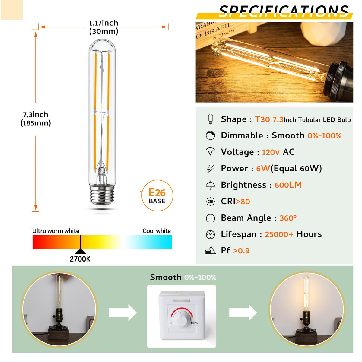 Tube Light Bulbs 7.3 Inch E26 T10 Led Bulb Tubular Light Bulb 185Mm Long Skinny Light Bulb,6W 60 Watt Type T Bulb For Wall Sconces, Pendant, Livingroom,2700K Solf White 600Lm,Pack Of 4