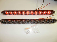 Application: for use on heavy duty trucks, semi trailers, cargo trailers, boat trailers, work vehicles and a wide or narrow overland vehicle requiring quality DOT rated lighting. Product Features: Brand new, waterproof, Super bright Red LED Surface Mount, sealed 15" light Each light has 11 Super Diodes for a Bright Performance. Functions as clearance, side marker or identification light, stop, turn, tail and brake light These light bars have 3 wires (White is ground, Black is running lights w/ low brightness,Red is turn and brake w/ high brightness.) They have 2 screw holes for mounting Comes with a Poly-carbonate Lens with All Weather Housing for durability Convert your old incandescent lights to more modern LED's. Dimensions: 15.5" x 1.25" x 0.5" Hole Center to Center is 14-1/2" Voltage:12V Wire Connection Tips: White Wire is the Ground; Red Wire is the high Output (Brake & Turn) ; Black Wire is the low output (marker lights). Product included: 2pcs 15 inch 11 LED Red stop, turn, tail and brake light bar Warning: This product can expose you to chemicals which is [are] known to the State of California to cause cancer and birth defects or other reproductive harm.