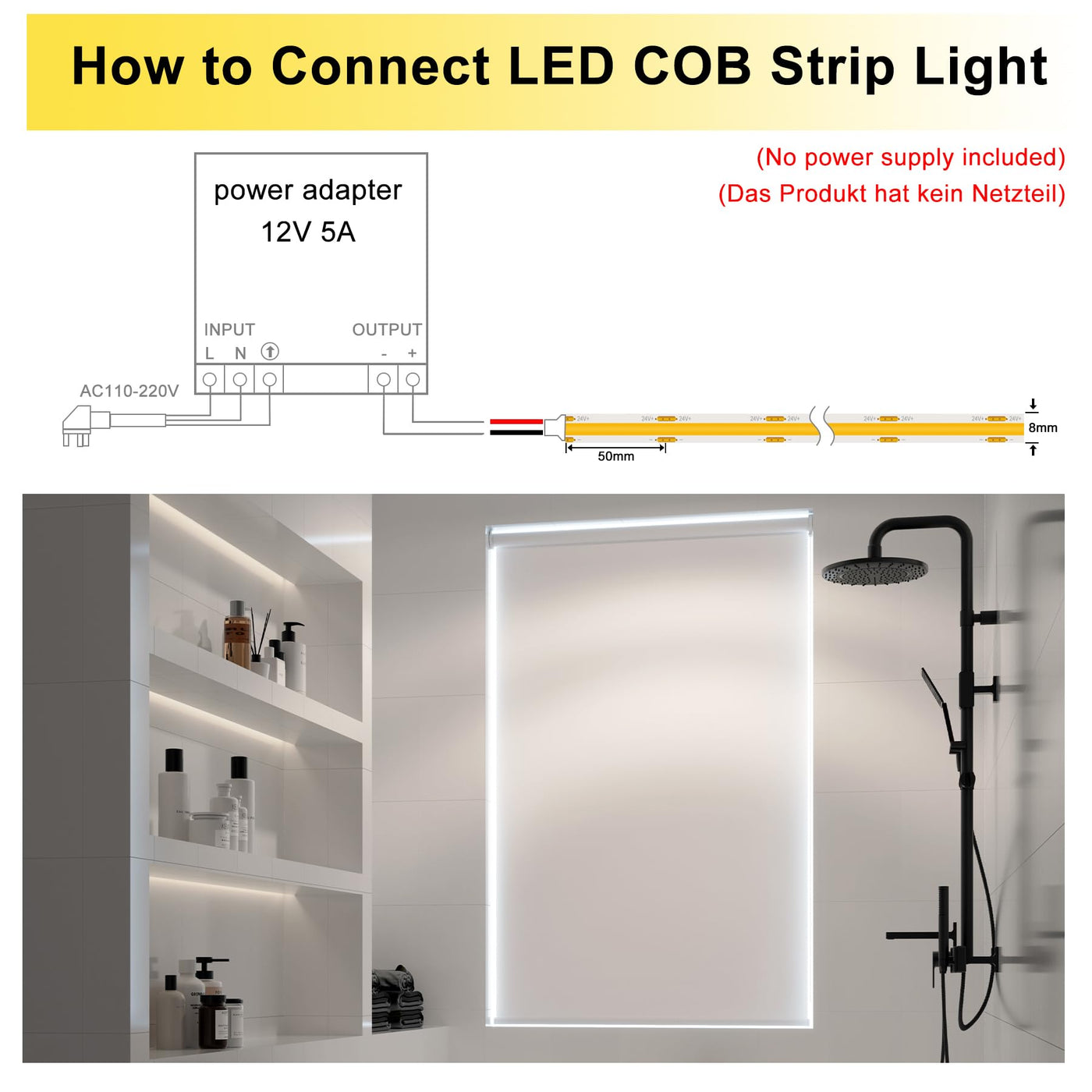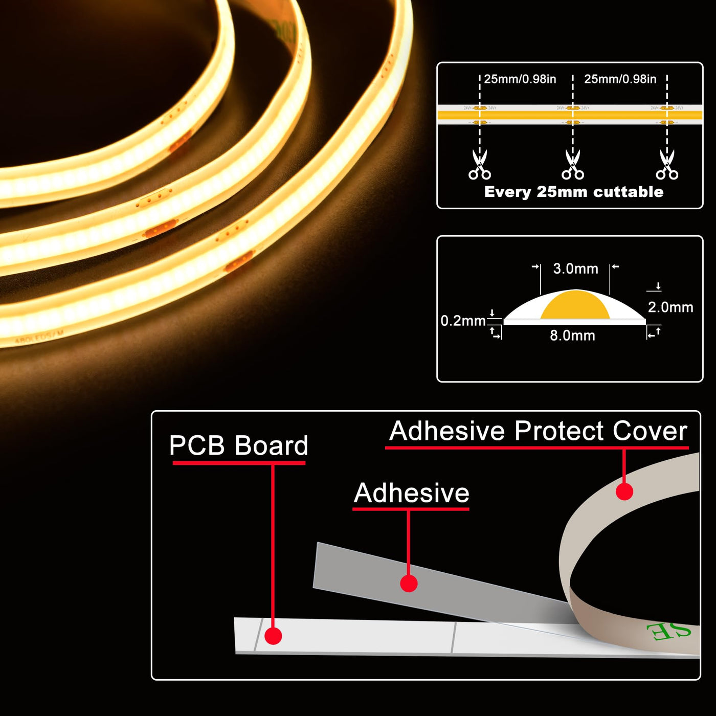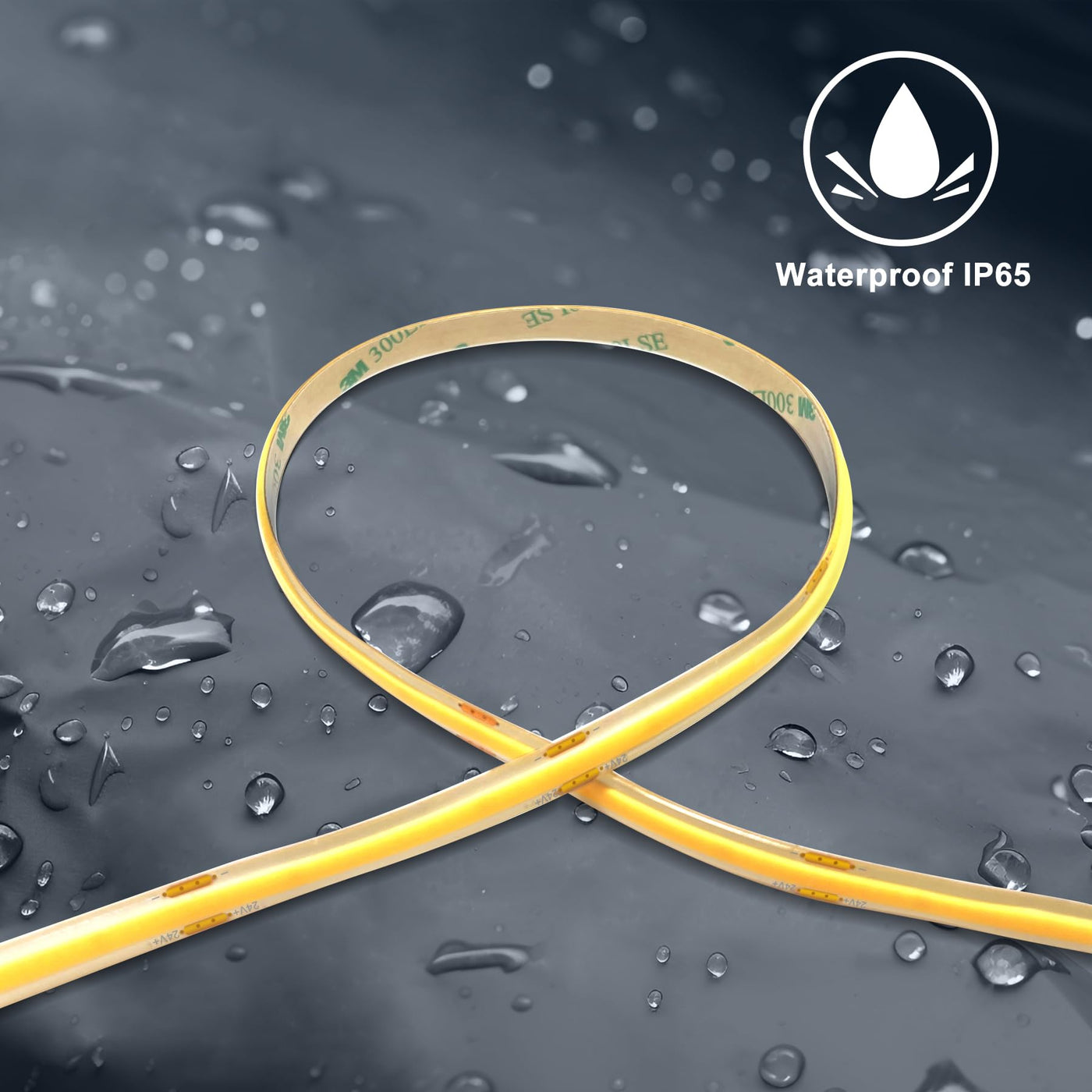 Ip65 Cob Led Strip Features The Following: 1. High Waterproof Rating: Ip65 Indicates That The Strip Has Strong Dust And Waterproof Capabilities, Making It Suitable For Semi-Outdoor Use And Able To Work Stably Even In Humid Environments. 2. High Brightness And Color Accuracy: Cob Led Provides High Brightness And Color Reproduction, Offering Clear, Bright, And Accurate Lighting Effects. 3. High Energy Efficiency: Cob Led Strips Typically Feature Energy-Saving And High-Efficiency Characteristics, Providing Good Lighting Effects While Reducing Energy Consumption. 4. Long Lifespan: Cob Led Has A Long Lifespan And Good Stability, Reliably Offering Lighting For Extended Periods. In Summary, Ip65 Cob Led Strips Have The Advantages Of Waterproofing, High Brightness, Color Accuracy, Energy Efficiency, And Long Lifespan, Making Them Suitable For Use In Semi-Outdoor, Humid Environments.