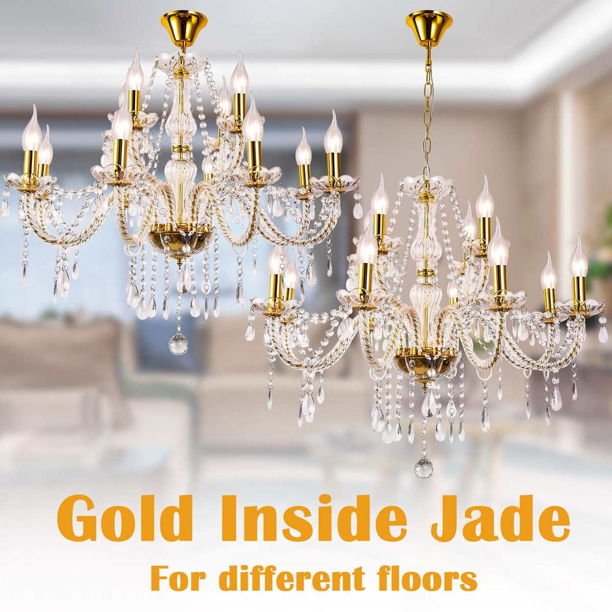 K9 Crystal Candle Chandelier:Made of glass and luxury K9 crystal, modern and elegant with lots of sparkle.Nothing is quite as elegant as the crystal chandeliers that gave sparkle to brilliant evenings at palaces and houses | E12 Bulb Required: It is E12 bulb base, can use E12 Halogen Bulbs,E12 Dimmable Bulbs,E12 Energy saving bulb and so on(bulbs not included) | Elegant Decoration:Classic european crystal light and candle shape, nice light decors for for home living room,hall,corridor,balcony,entrance,You will fell in love with this chandelier which can creative a romantic atmosphere and gave soft sparkle to brilliant evenings | Installation:Need assembly by the customer includes the wiring, professional installation is recommended. Installation video shows in the link(manual also include installation link,you can open seperately )If you need any help please feel free to contact us | Product Size:With adjustable chain,you can adjust the light lenght to meet your needs;12 crystal lamps inch Size(fx H): 31.6in x 25.6in