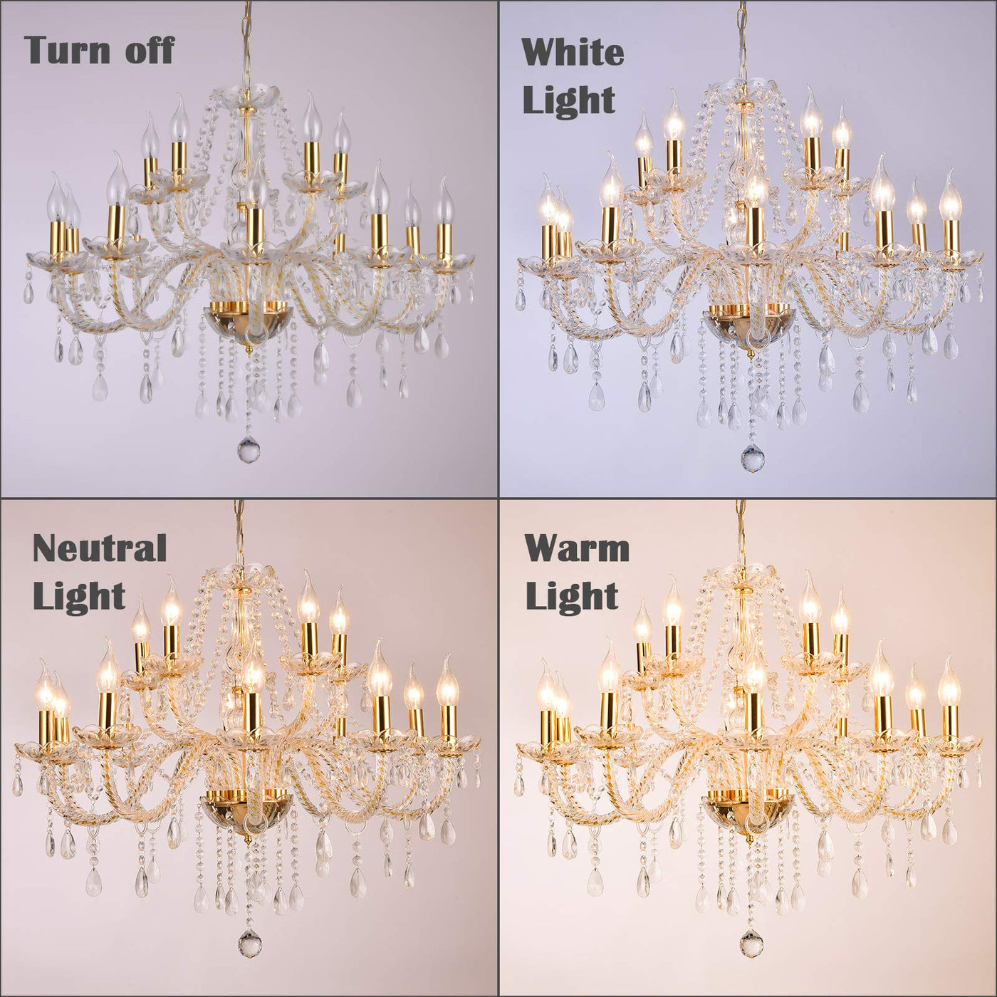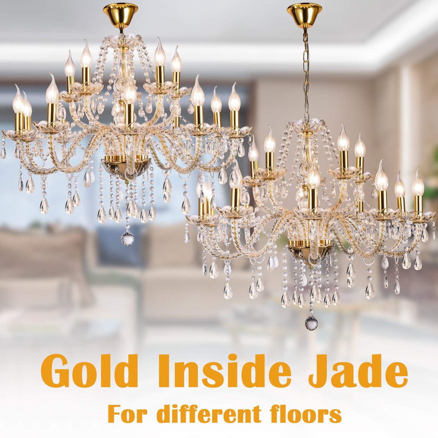 K9 Crystal Candle Chandelier:Made of glass and luxury K9 crystal, modern and elegant with lots of sparkle.Nothing is quite as elegant as the crystal chandeliers that gave sparkle to brilliant evenings at palaces and houses | E12 Bulb Required: It is E12 bulb base, can use E12 Halogen Bulbs,E12 Dimmable Bulbs,E12 Energy saving bulb and so on(bulbs not included) | Elegant Decoration:Classic european crystal light and candle shape, nice light decors for for home living room,hall,corridor,balcony,entrance,You will fell in love with this chandelier which can creative a romantic atmosphere and gave soft sparkle to brilliant evenings | Installation:Need assembly by the customer includes the wiring, professional installation is recommended. Installation video shows in the link(manual also include installation link,you can open seperately )If you need any help please feel free to contact us | Product Size:With adjustable chain,you can adjust the light lenght to meet your needs;15 crystal lamps inch Size(fx H): 31.6in x 25.6in