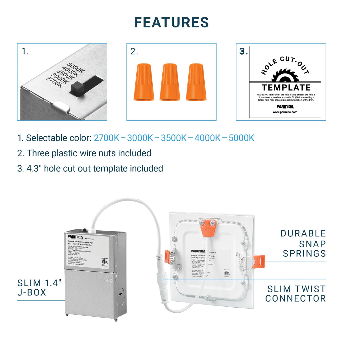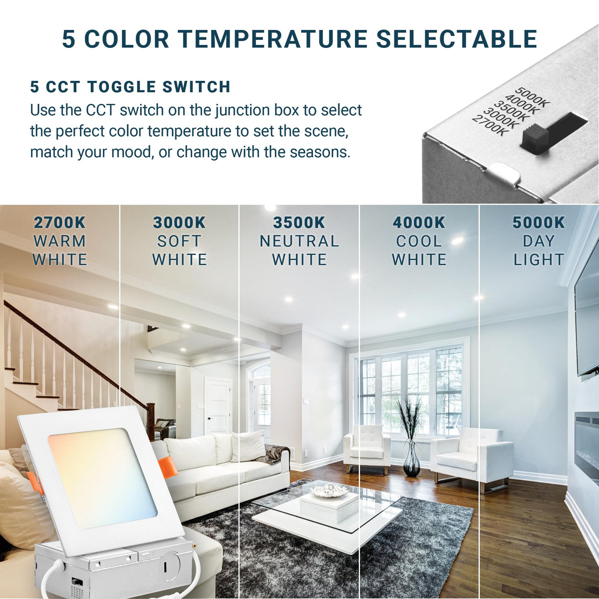 Parmida (12 Pack) 4 Inch Square 5Cct Ultra Thin Led Recessed Lighting With Junction Box, 2700K/3000K/3500K/4000K/5000K 5 Color S