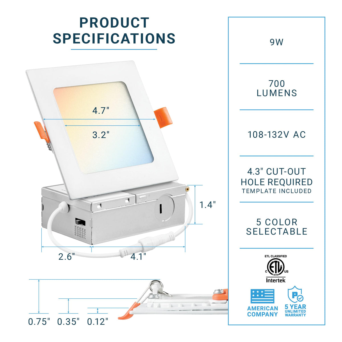 4 Inch Led Ultra-Thin Square Recessed Ceiling Light With Junction Box. This Lighting Comes With 5 Adjustable Color Temperatures - 2700K 3000K 3500K 4000K 5000K, Ready To Illuminate Any Space Around Your House, Office Space, And More. Canless Slim Panel Downlight. 9W, Ic Rated, And Etl-Listed.