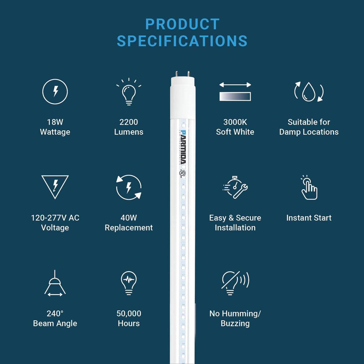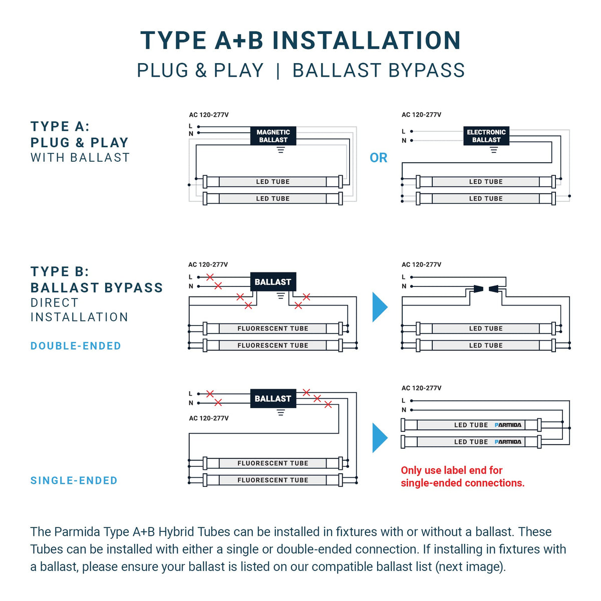 Parmida 20-Pack Led T8 Hybrid Type A+B Light Tube, 4Ft, 18W (40W Replacement), Clear Cover, Single-End Or Dual-End Powered, 3000