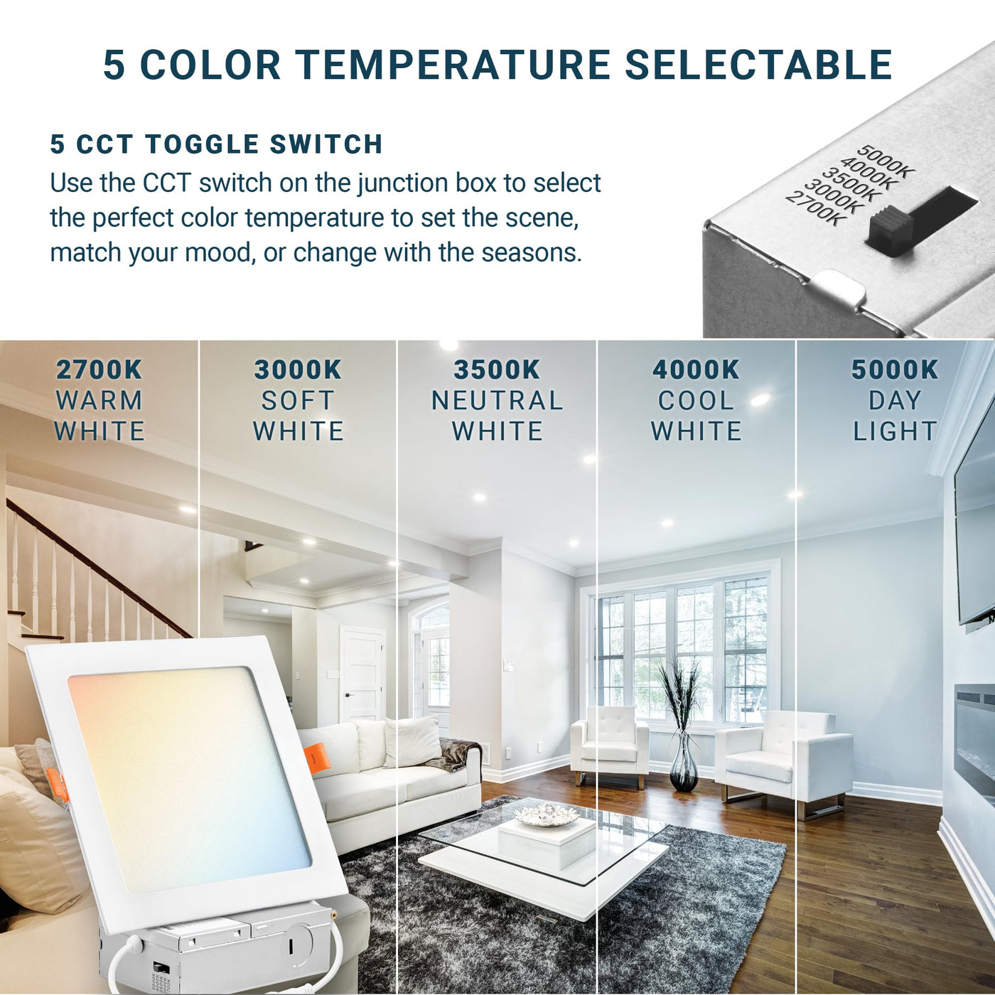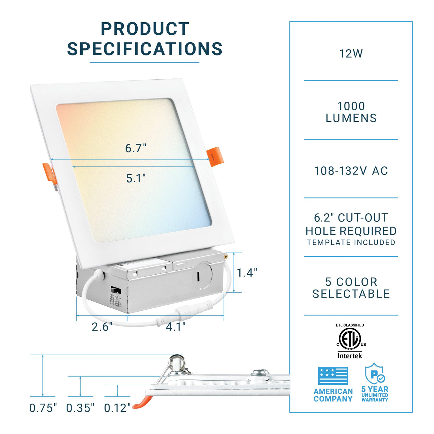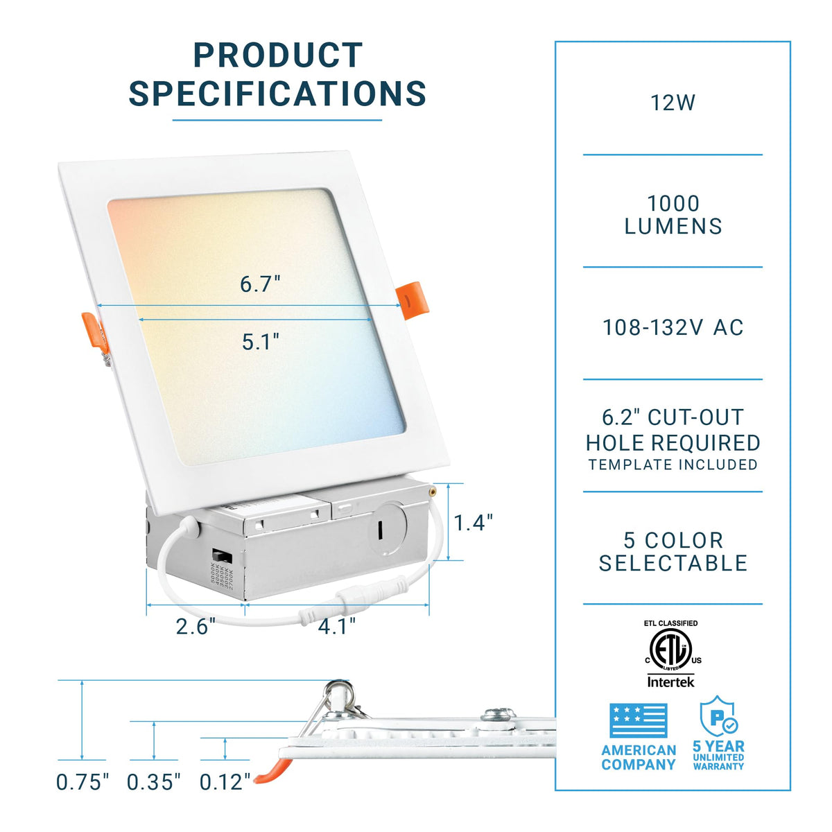 6 Inch Led Ultra-Thin Square Recessed Ceiling Light With Junction Box. This Lighting Comes With 5 Adjustable Color Temperatures - 2700K 3000K 3500K 4000K 5000K, Ready To Illuminate Any Space Around Your House, Office Space, And More. Canless Slim Panel Downlight. 12W, Ic Rated, And Etl-Listed.