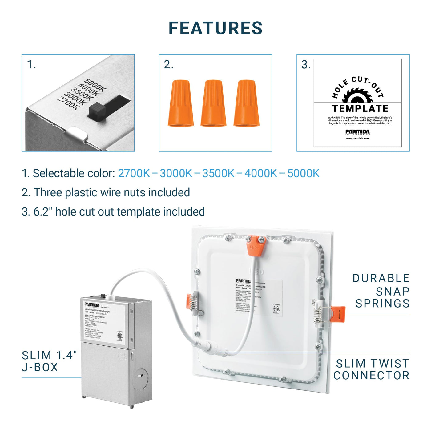 Parmida (6 Pack) 6 Inch Square 5Cct Ultra Thin Led Recessed Lighting With Junction Box, 2700K/3000K/3500K/4000K/5000K 5 Color Se