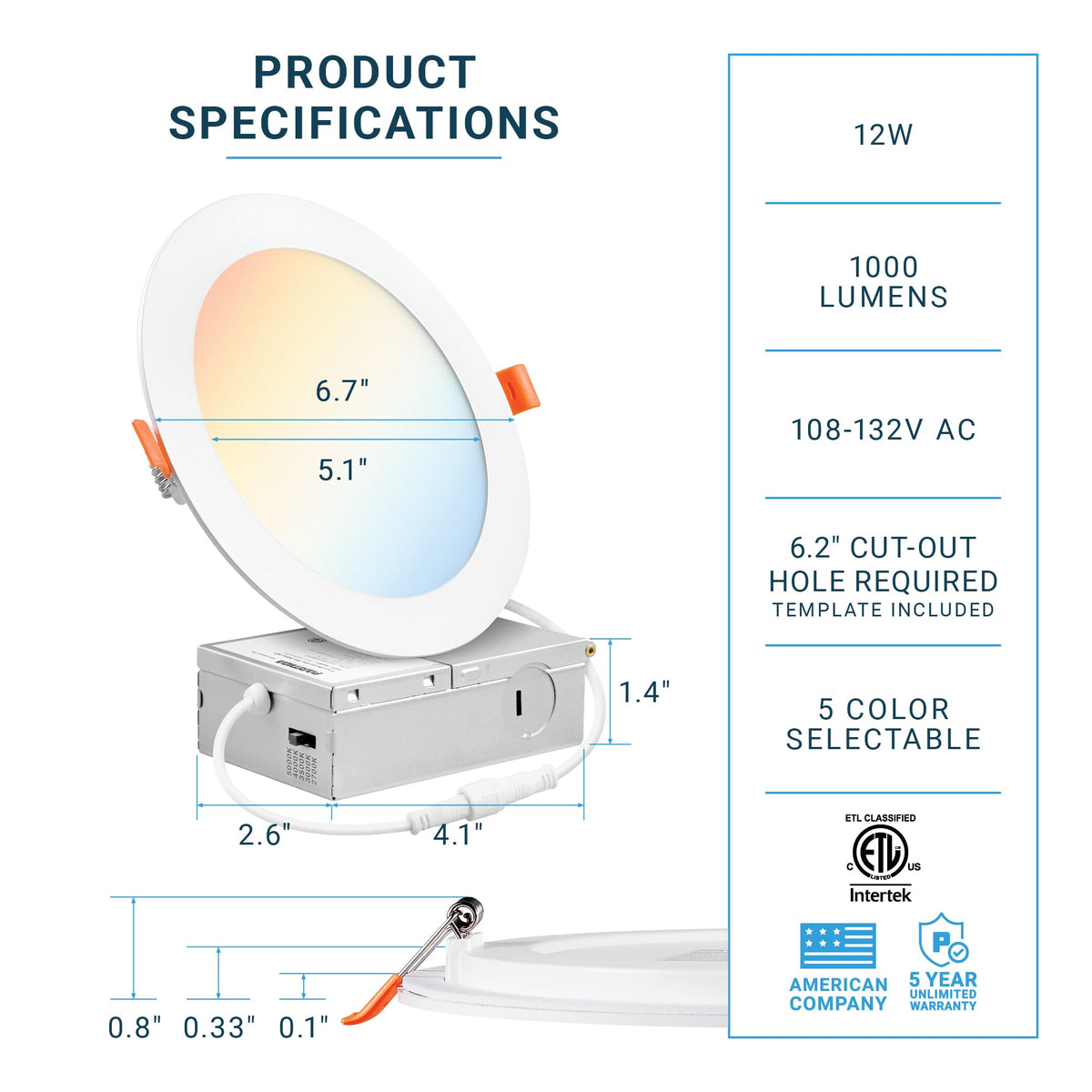 6 Inch Led Ultra-Thin Recessed Ceiling Light With Junction Box. This Lighting Comes With 5 Adjustable Color Temperatures - 2700K 3000K 3500K 4000K 5000K, Ready To Illuminate Any Space Around Your House, Office Space, And More. Canless Slim Panel Downlight. 12W, Ic Rated, And Etl-Listed.