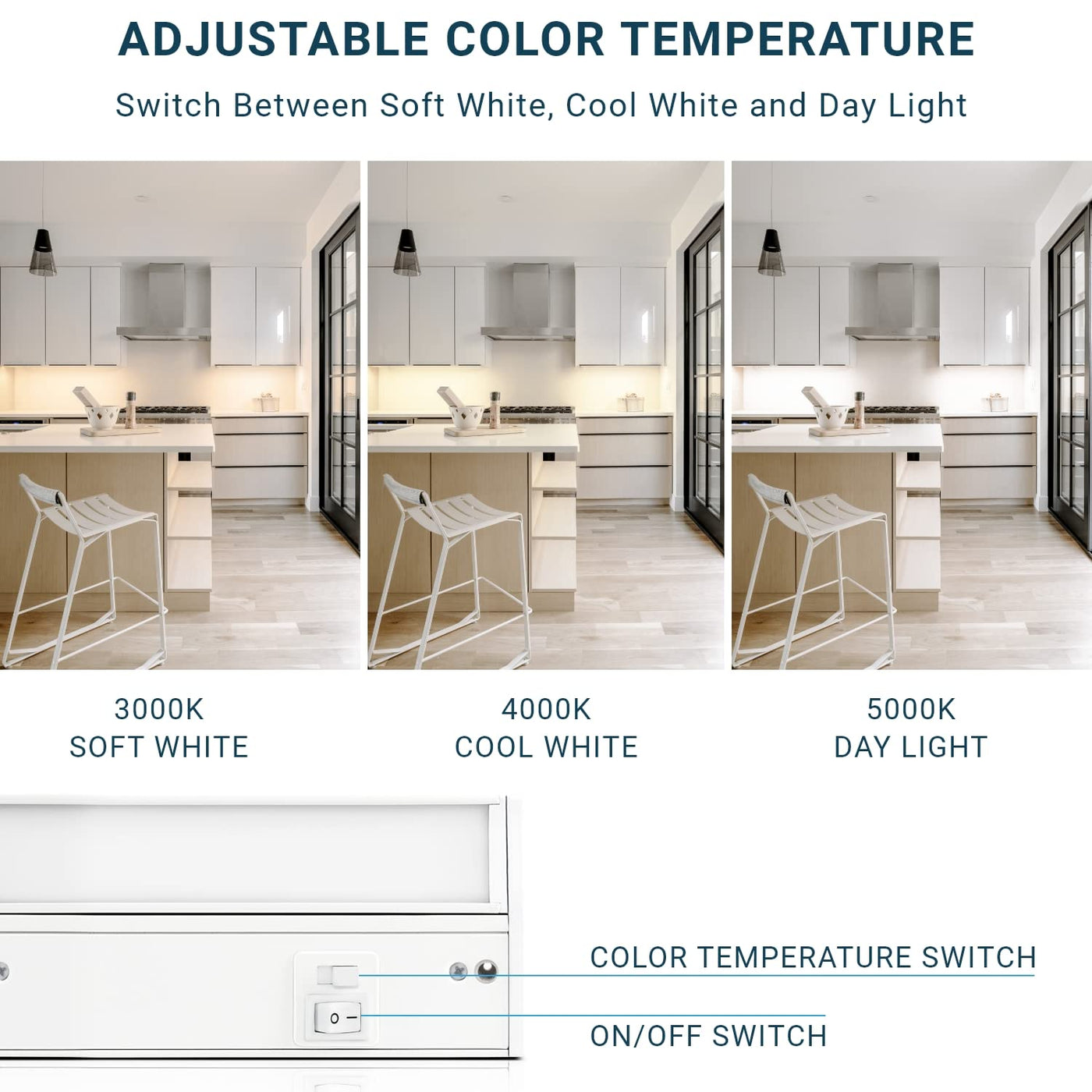 Q: What are the different color temperature options available for the PARMIDA LED Swivel Under Cabinet Lighting?A: The PARMIDA LED Swivel Under Cabinet Lighting features a 5-in-1 color level switch, allowing you to choose from five color temperatures: Warm White (2700K), Soft White (3000K), Cool White (4000K), Day Light (5000K), and Cool White (6000K).