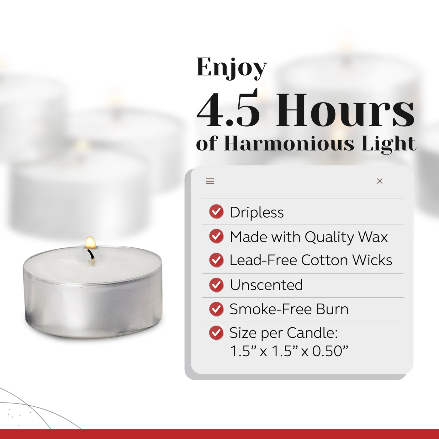 Q: How long do PARNOO tea light candles burn?A: PARNOO white tea light candles have a long burn time of up to 4.5 hours, providing a steady and continuous flame for your events.