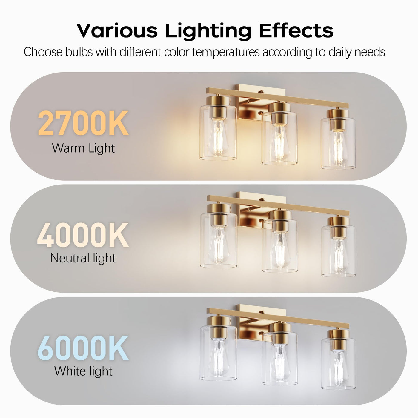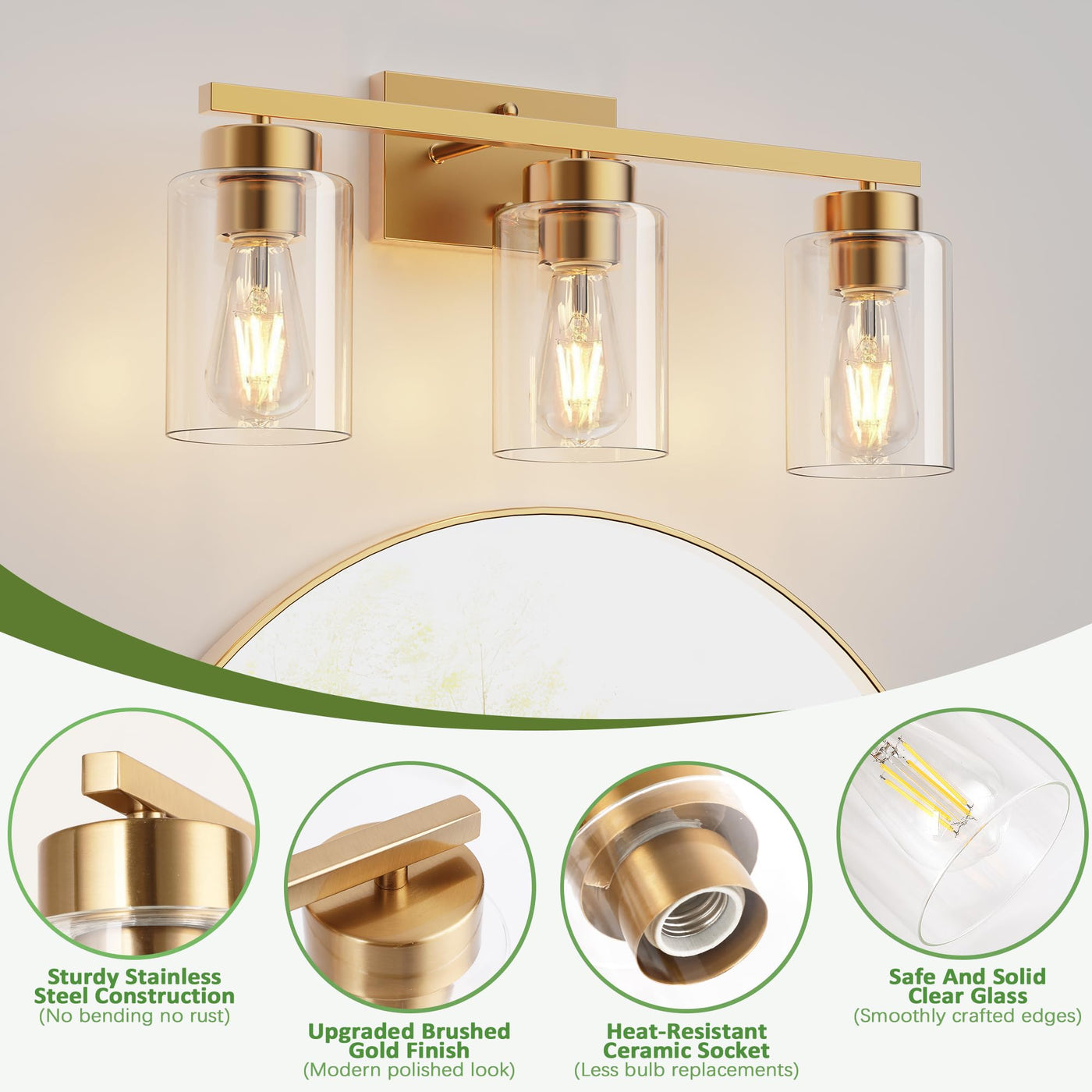 3-Light Bathroom Light Fixtures Brushed Gold Vanity Light With Clear Glass Shade Modern Wall Sconce For Mirror Bedroom Living Room Hallway Lighting