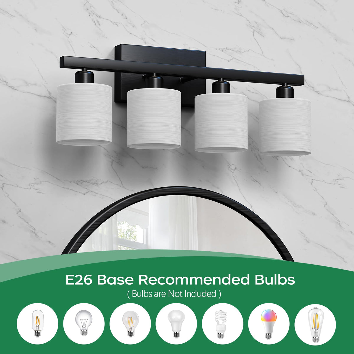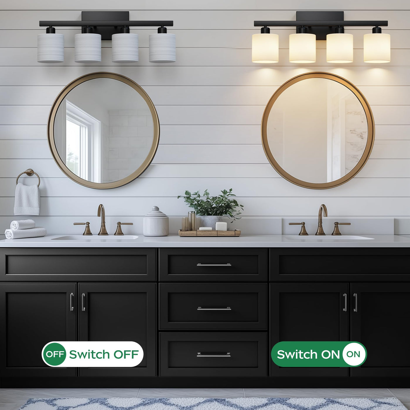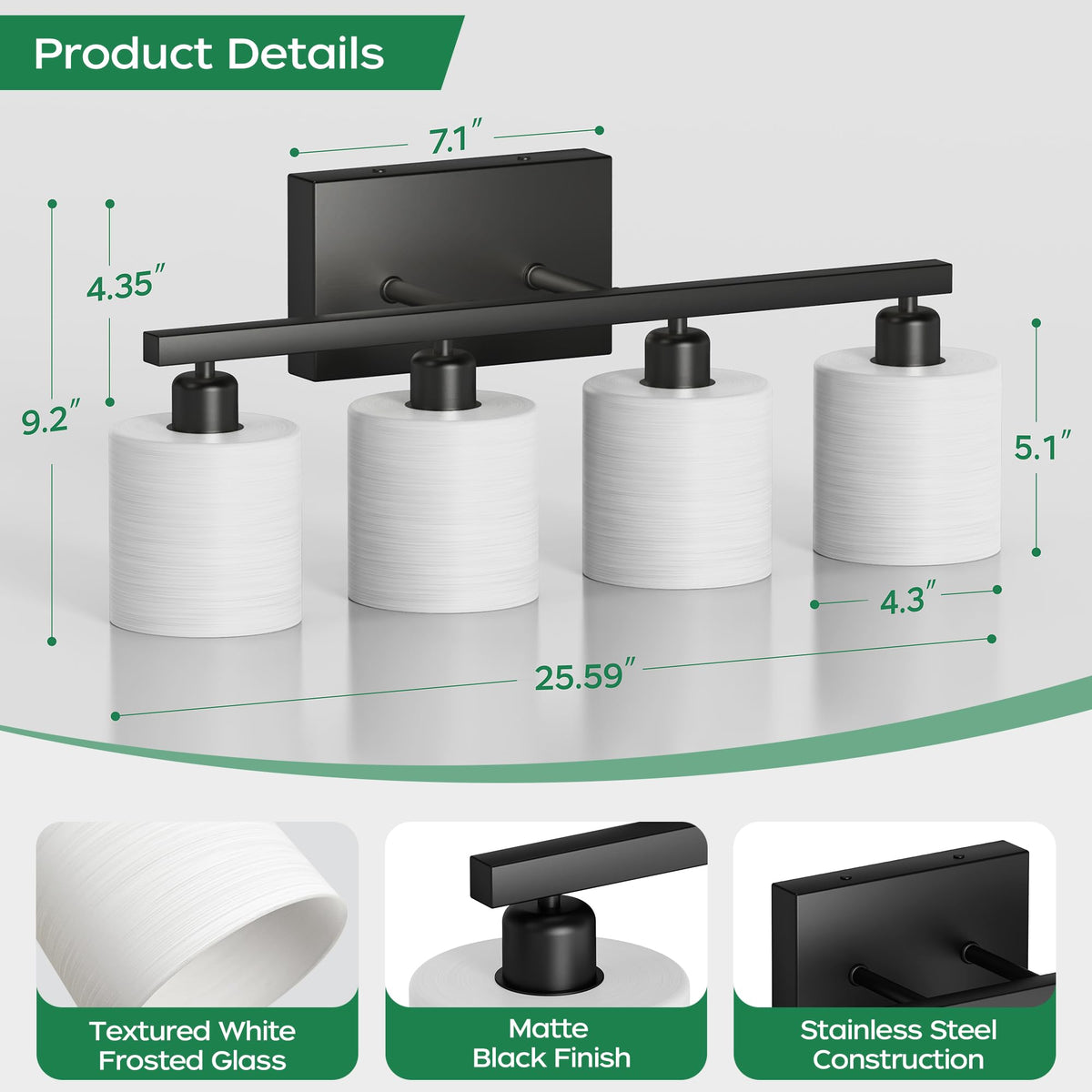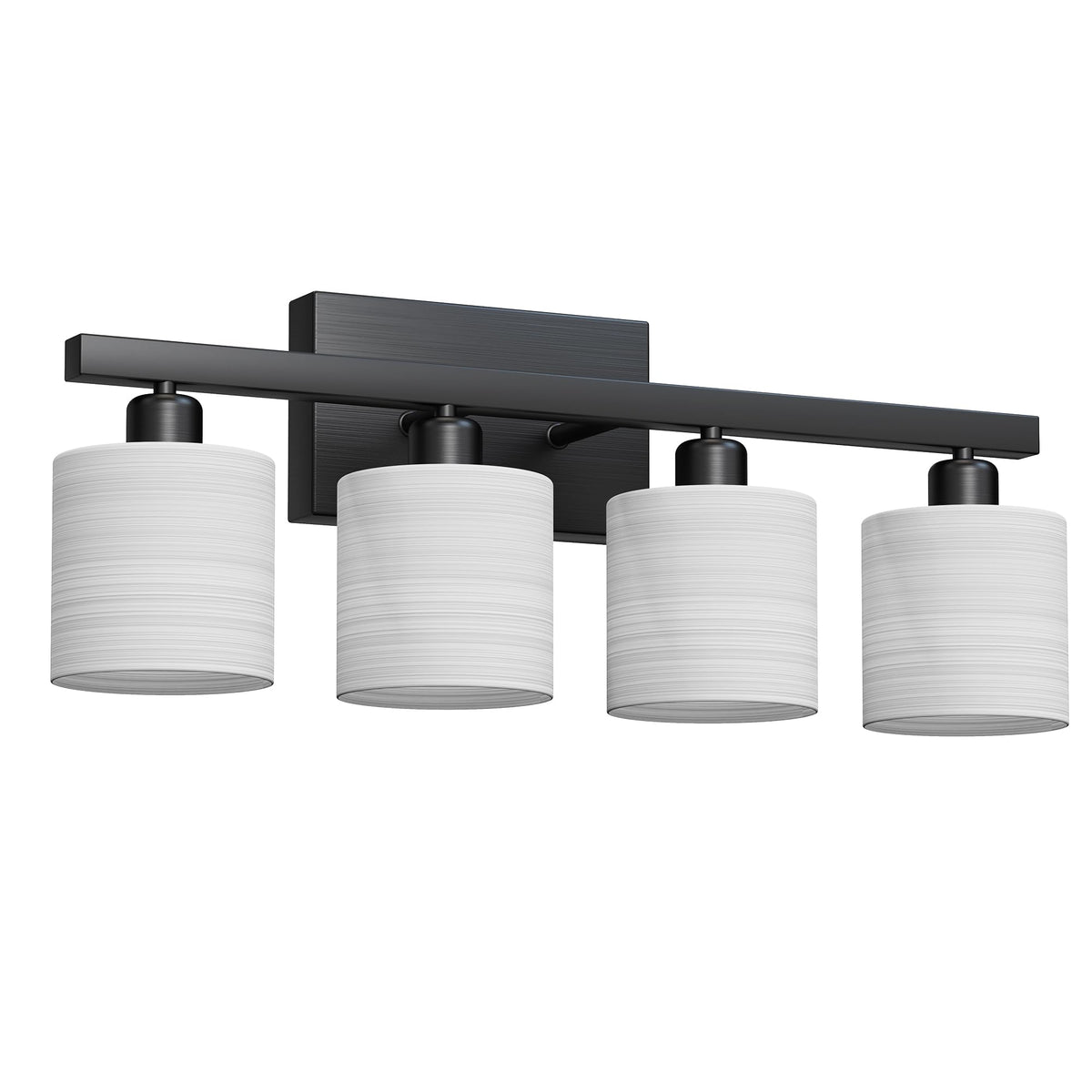 Partphoner Classic Vanity Lights, Modern Bathroom Vanity Light With Textured White Glass Shade, Matte Black, 4-Light