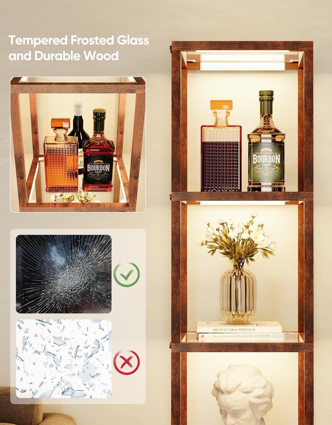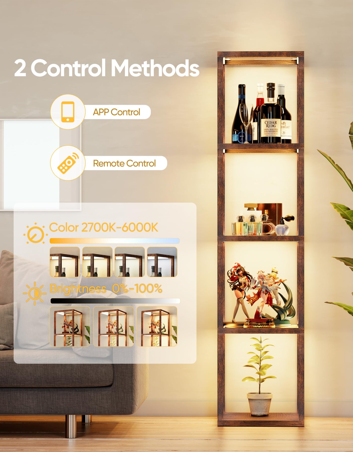 Partphoner Floor Lamp Glass Display Shelf With Remote/App Control, Dimmable Led Floor Lamp With Shelves, Open Display Cabinet, Color Temp Control (2700K-6000K), Rustic Brown