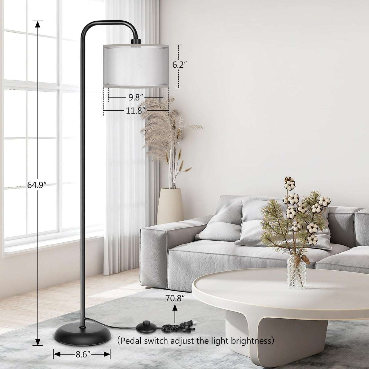 Q: What is the length of the power cord for the lamp?A: The power cord of the lamp measures 70.8 inches, providing ample length to reach from the socket to your preferred seating area, making it convenient for placement near sofas, armchairs, or desks.