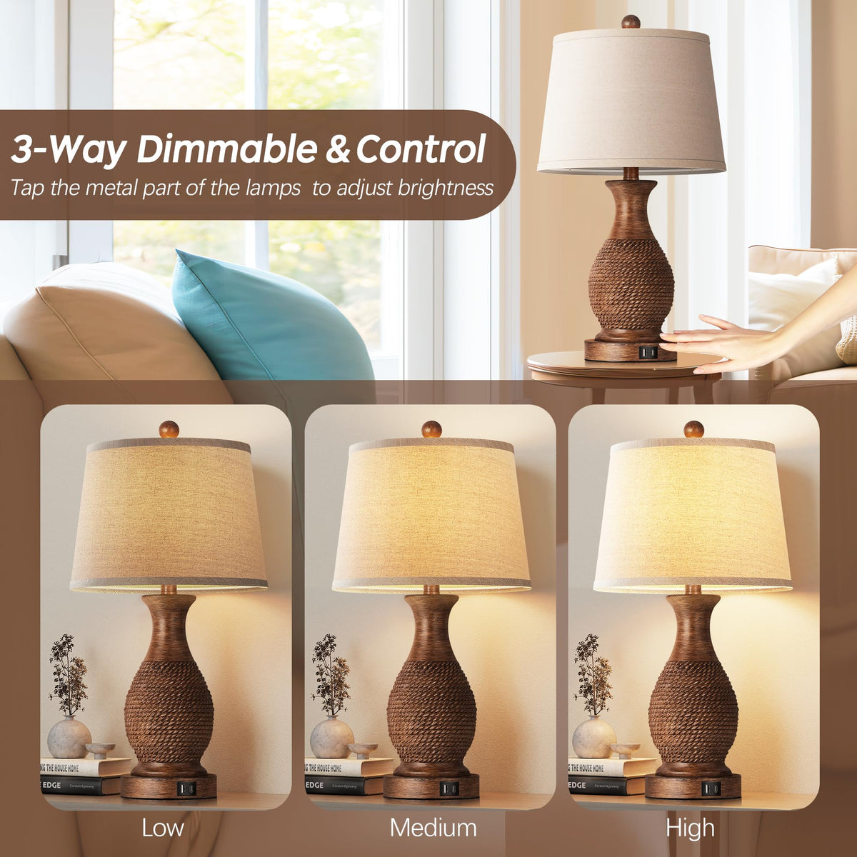 Partphoner Table Lamps Set Of 2, Bedside Touch Lamp With Usb C+A Charging Ports, Side Table Lamp With Linen Fabric Shade (Led Bulbs Included), Wood