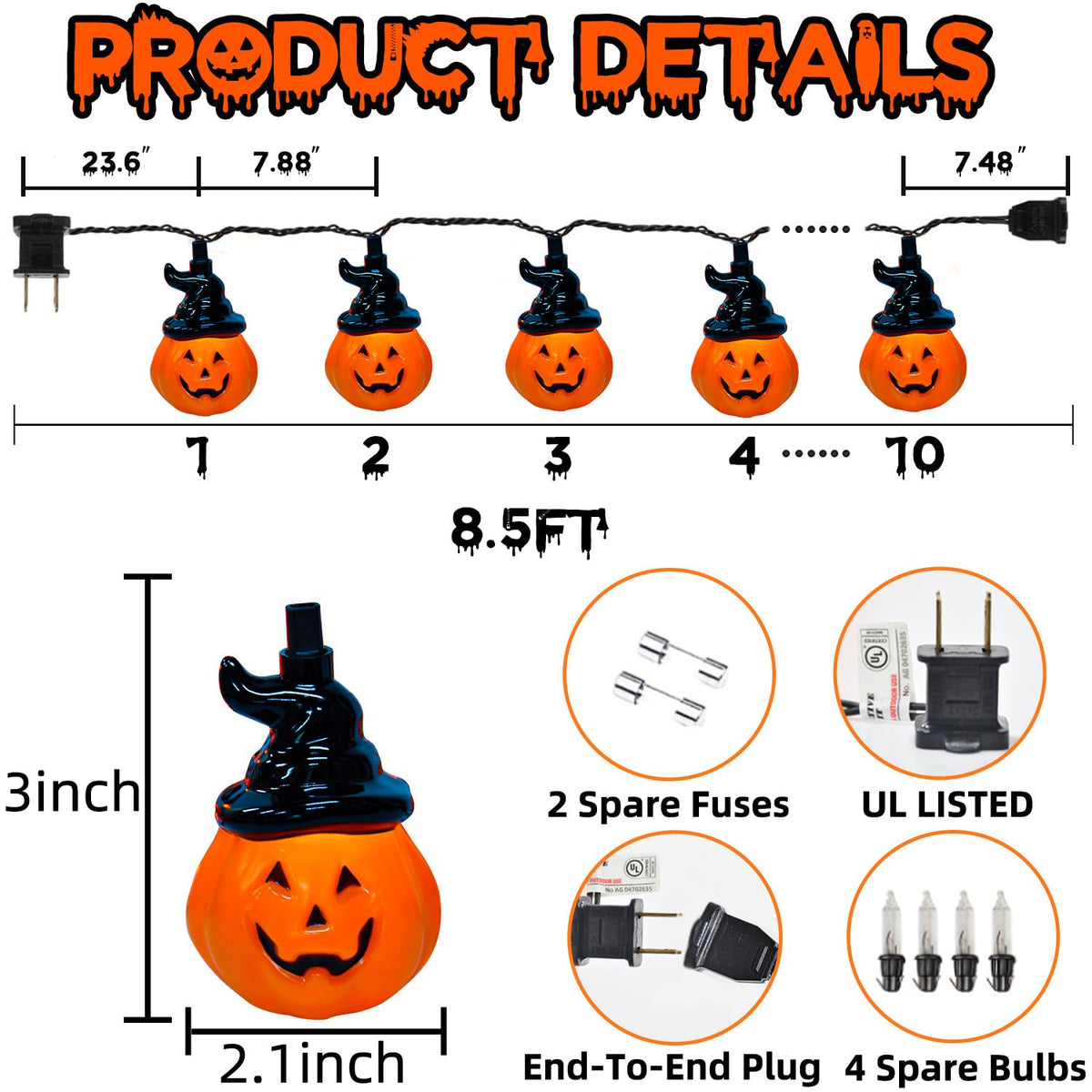 < p >Light up your Halloween night with PAUSTO cute plastic Jack O lantern pumpkin lights!< /P > < p >Product: 8.5 Feet Jack O lantern light with 10Pcs mini orange bulbs and 10Pcs plastic pumpkin lantern lights< /P > < p >Mini Orange Bulb Type: incandescent light bulbs< /P > < p > Incandescent Bulbs Specifications: 120Volts, 0.84Watts per bulb, 8.4Watts per string< /P > < p > Package including: < br > 1 X 8.5feet Halloween Jack O lanterns pumpkin string lights< br > 4 X replacement mini orange bulbs< br > 2 X spare bulbs< br > 1 X using instructions< br >< /P > < p >Widely Use: Our pumpkin lantern string lights with cute and spooky Jack-O smile, perfect as Halloween decor lights indoor, such as Halloween home decor lights, Halloween party lights, Halloween stair & fireplace decor lights, Halloween wall decor lights and more.< /P > < p >Halloween Pumpkin string lights plug in also ideal as Halloween outdoor decorations lights because the IP44 waterproof, such as Halloween porch, door, backyard, patio, fence decorations lights, Halloween tree lights, lawn lights, Halloween camper lights and more. < /P > < p >This Halloween pumpkin lights total 8.5 Feet, 6" spacing from male to the first bulb, 6" spacing from female connector to the last bulb,12" spacing between each bulb, cute pumpkin lights allow end to end connect and connecting up to 25 sets of the same pumpkin Halloween lights (not exceeding 216 Watts).< /P > < p >Excellent Quality and Durable: The adorable Halloween pumpkin lights string are made with high-quality plastic materials, ensuring they can withstand various weather conditions. Rain or shine, these outdoor pumpkin lights will continue to shine brightly throughout the Halloween season.< /P > < p >Mesmerizing Glow: Each mini orange bulb in our pumpkin lights emits a mesmerizing and warm orange glow, which will add a touch of spooky and joy to your Halloween decorations< /P >
