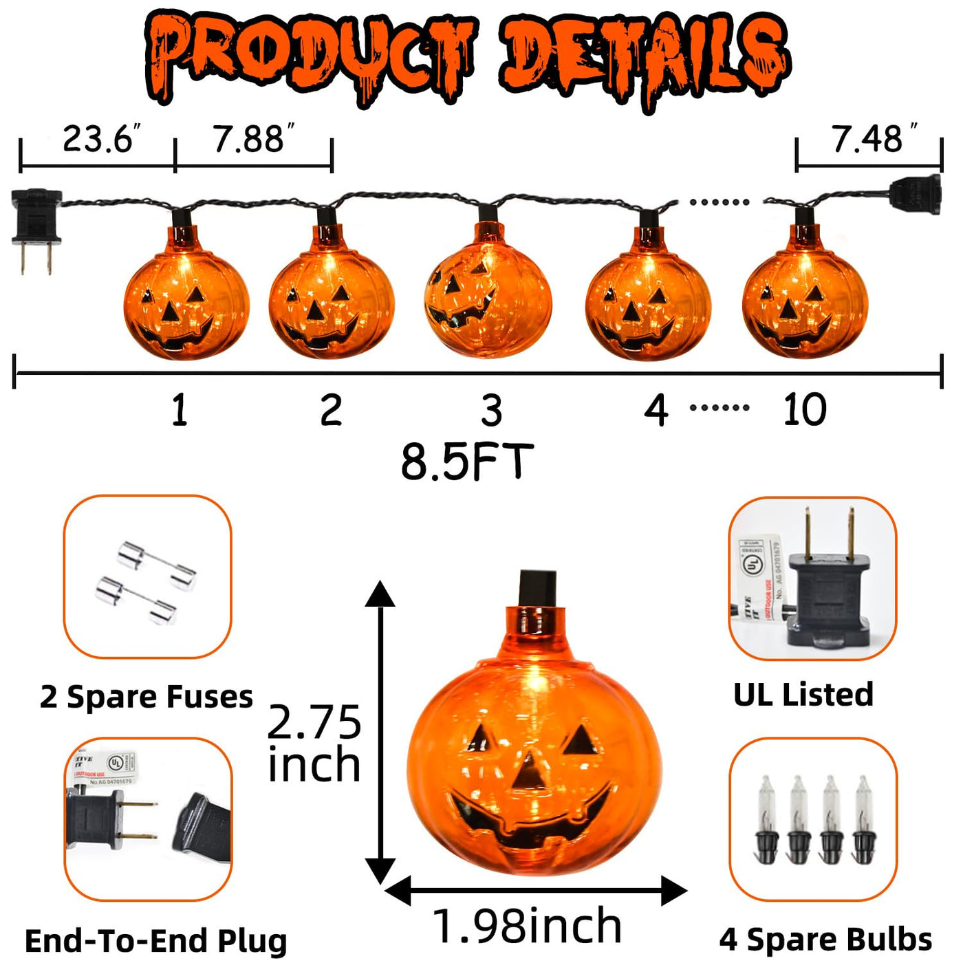 Q: How long is the PASUTO Halloween Pumpkin String Lights?A: The PASUTO Halloween Pumpkin String Lights measure a total of 8.5 feet in length, featuring 10 mini orange bulbs and 10 pumpkin lanterns spaced evenly along the string.