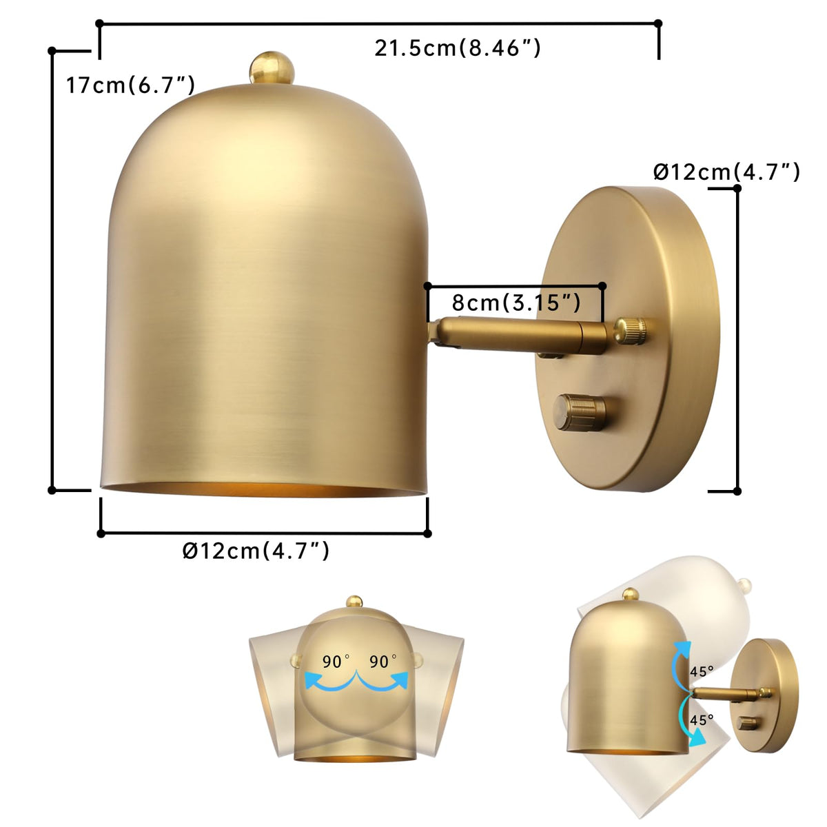 Pathson Set Of 2 Modern Wall Sconce Dimmer Switch, Brass Finish Wall Light Lamp Adjustable Light Angle Wall Vanity Lighting, E26